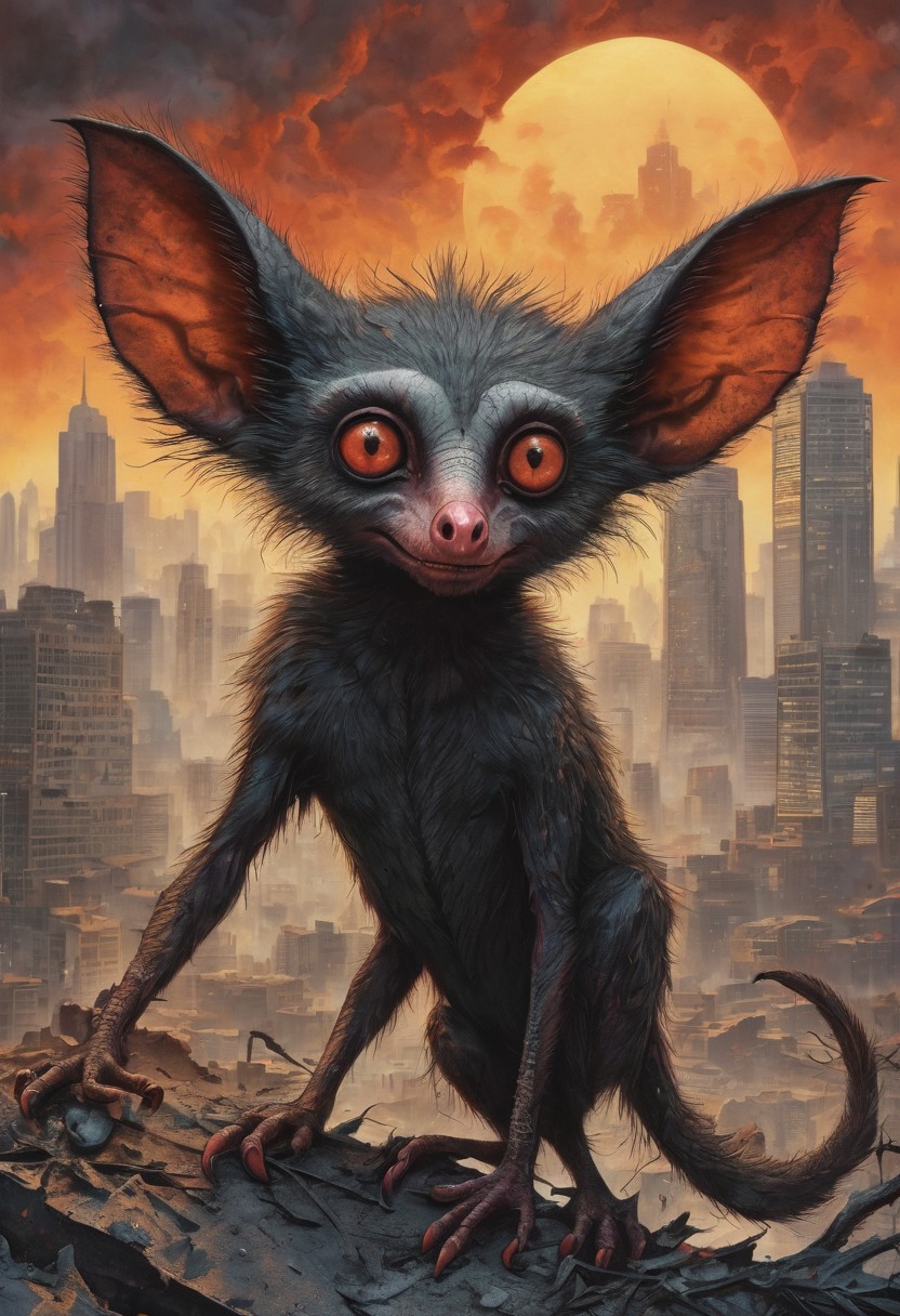 a vivid, hand-drawn movie poster illustration depicting an anthropomorphic aye-aye creature amidst a post-apocalyptic landscape. In the foreground, the aye-aye stands tall, its long, spindly arms outstretched, grasping the remnants of a decaying city skyline. Gnarled metal and glass debris litter the ground, contrasting starkly with the aye-aye's soft, fluffy fur. Its eyes gleam with an eerie red light, hinting at the fierce intelligence and adaptability that define its species. The background features swirling clouds of smoke and ash, casting an ominous, foreboding atmosphere. Crumbling skyscrapers and toppled buildings form a shattered, dystopian cityscape. In the distance, the sun peeks through the haze, casting a faint orange glow across the apocalyptic wasteland. The overall aesthetic blends science fiction elements with naturalistic details of the aye-aye's anatomy. Intricate shading and texture work convey the harshness of the environment and the creature's resilience in surviving against impossible odds.