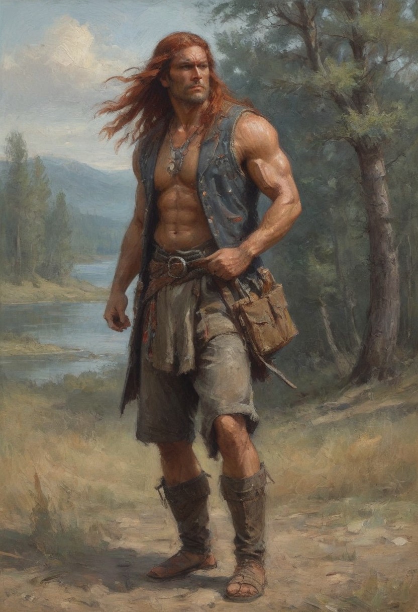 a side view of A strong muscular warrior with red long hair, standing, wearing vest with pocket and short with pocket and a moccasin cover his feet, full body, oil painting, story board illustration