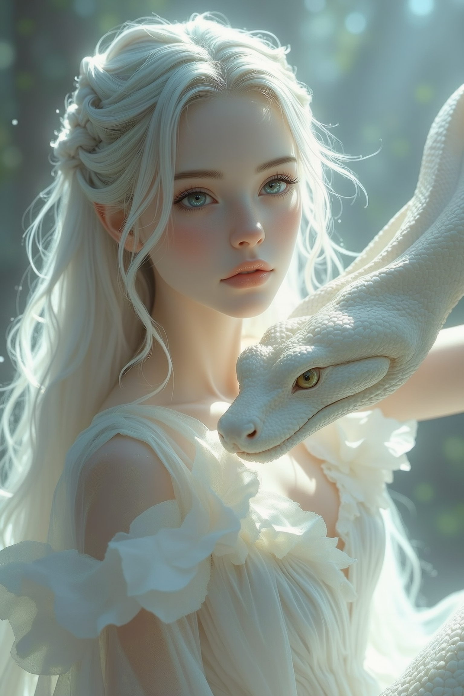 A surreal and hyper-realistic scene featuring a classical beauty dressed in a flowing white silk gown, accompanied by a majestic white snake. The intricate details of her attire and the snake's scales are highlighted, set against a dreamy, ethereal background. The scene is illuminated with soft, magical lighting, enhancing the otherworldly and enchanting atmosphere. surreal, hyper-realistic, classical beauty, white silk gown, majestic white snake, intricate details, dreamy background, ethereal, soft magical lighting, enchanting, otherworldly, visually stunning, high quality, detailed, sharp clarity, breathtaking, elegant, graceful. looking at viewer, long hair, white hair, <lora:Midjourney_-_SemiReal_Dreams_FLUX_LoRA:0.85>