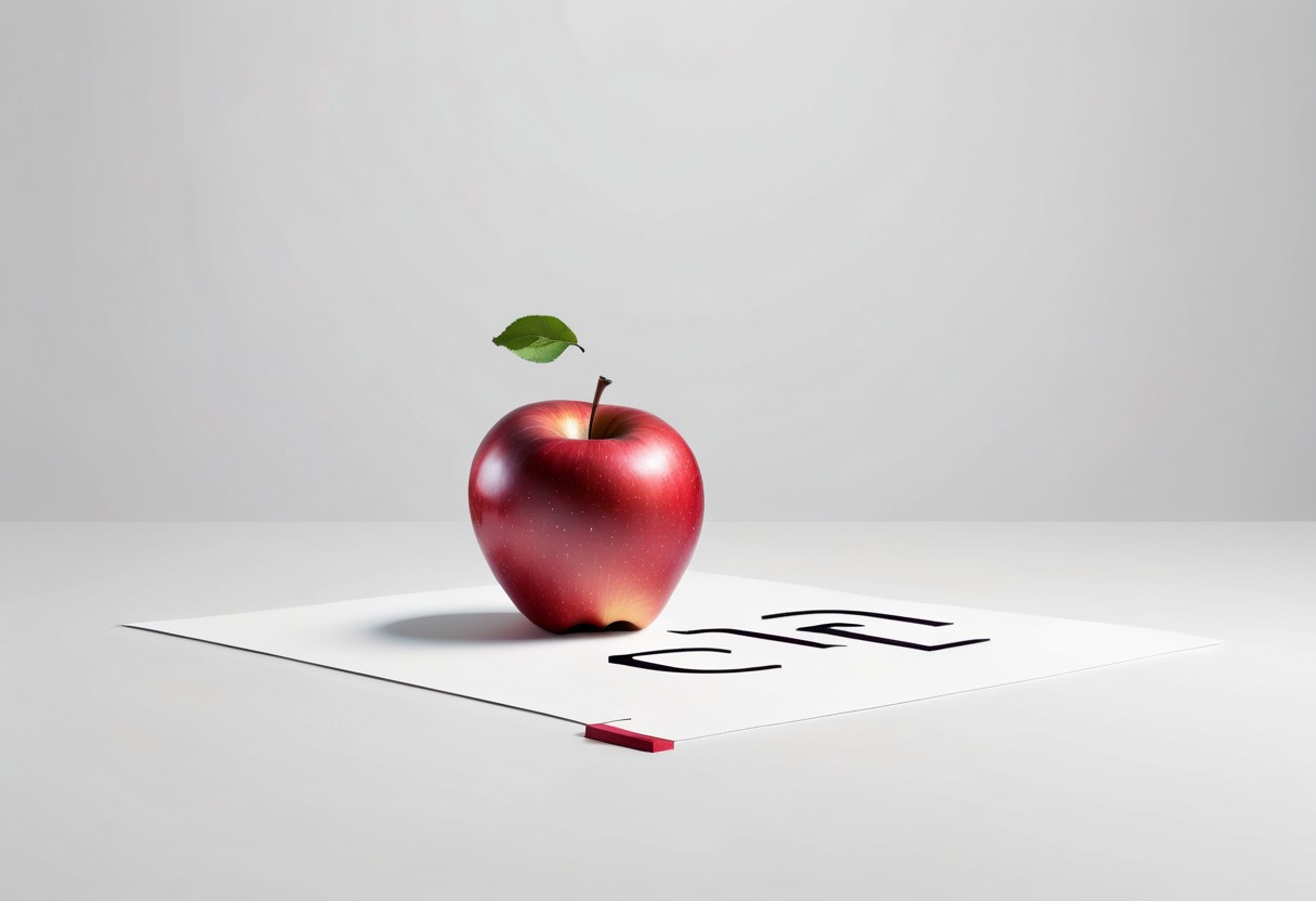 White background, empty space, bright emptiness. A (giant apple:1.4) has an argument with the (letter P:1.4) and the (letter C:1.4).