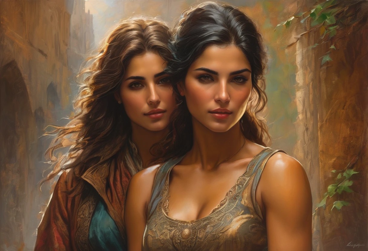 an extremely detailed oil painting by Jay Anacleto of a passionate romantic encounter between two 30-year-old iranian women. the woman are gazing lovingly at one another. the women are muscular brawny atheltic physically fit with defined abs. the women are devastatingly gorgeous handsome, with distinct facial structures. one woman is significantly taller than the other. a colorful dynamic romantic emotional background. a masterpiece.