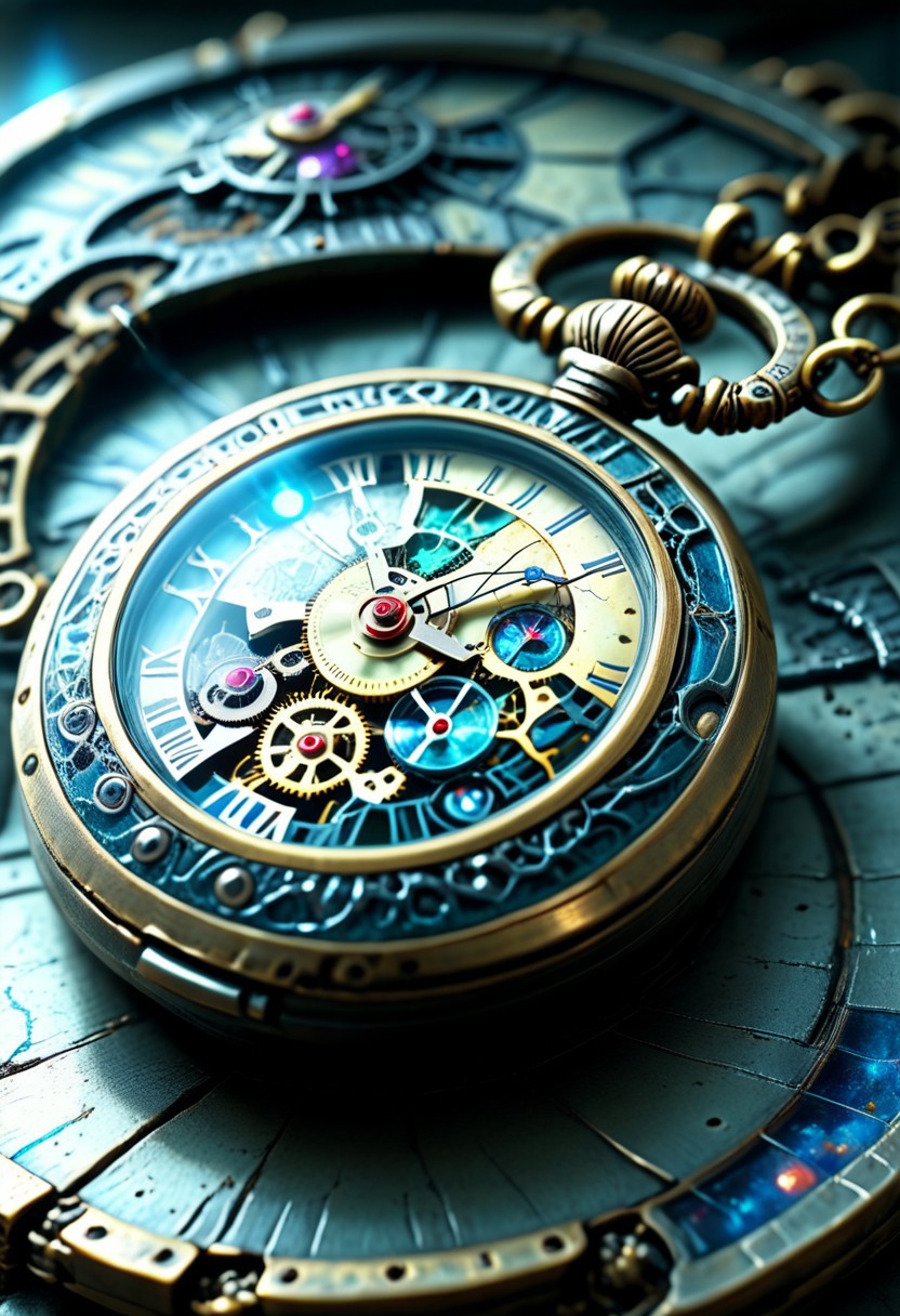 a close-up photograph of a pocket watch with a chain attached to it. The pocket watch has a round face with a gold-colored metal frame and a black chain. The face of the watch is decorated with intricate cybernetic designs and patterns in shades of blue, green, and purple. In the center of the face, there is a circular design with a red and blue gemstone in the center. The design appears alien in origin, like something from the far future. The background is a textured surface with cracks and crevices. The overall mood is mystical and dreamlike., no humans, still life, watch, pocket watch, compass, crack, blurry, chain, cracked floor, clock, fantasy, shadow, depth of field, light particles, gears, realistic, scenery, roman numeral