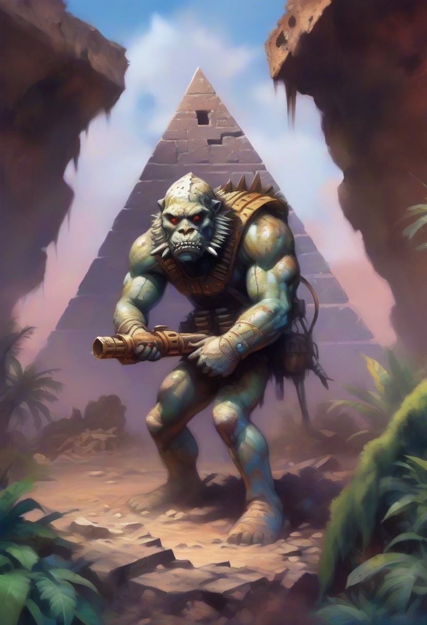 <lora:fr4z3tt4:0.75>fr4z3tt4, detailxl, young male in military camouflage clothing weld a hammer, battle Borderlands yeti creature, ancient pyramid ruins arena in jungle , view from behind, inspired by Borderlands,