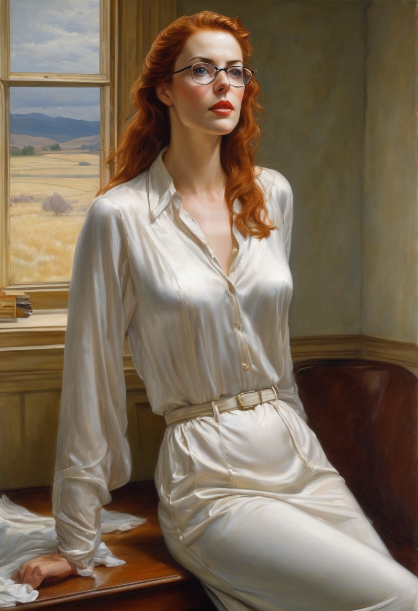 (Style of Larry Elmore and Jean-François Millet and Edward Hopper) score_9, score_8_up, romantic painting of a sexy woman, age 40 milf, pale skin, hyperrealistic oil painting, athletic fit figure, pale porcelain skin, (large breasts), long flowing auburn hair with silver highlights, cute glasses, intimate boudoir, soft natural lighting, brushstrokes visible.