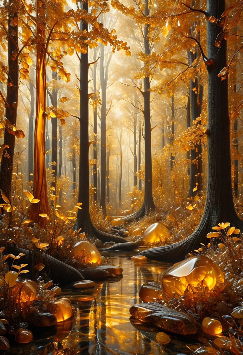 surreal, a forest where the trees are made of liquid glass, constantly shifting and changing shape, glowing flora and ethereal light, whimsical and magical ,<lora:ral-amber:1> ral-amber <lora:add-detail-xl:1>, <lora:MJ52:0.35>, <lora:SDXLFaeTastic2400:0.325>, (settings by AIDigitalmediaaggency:0.0001), OverallDetailXL