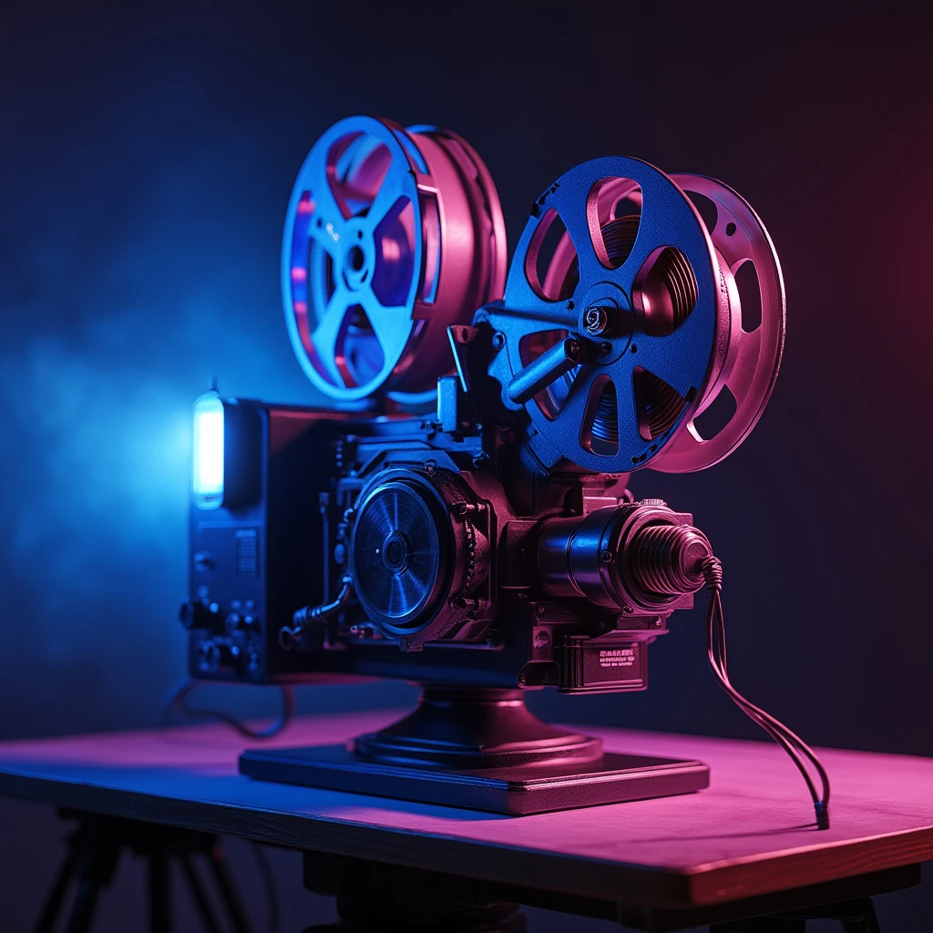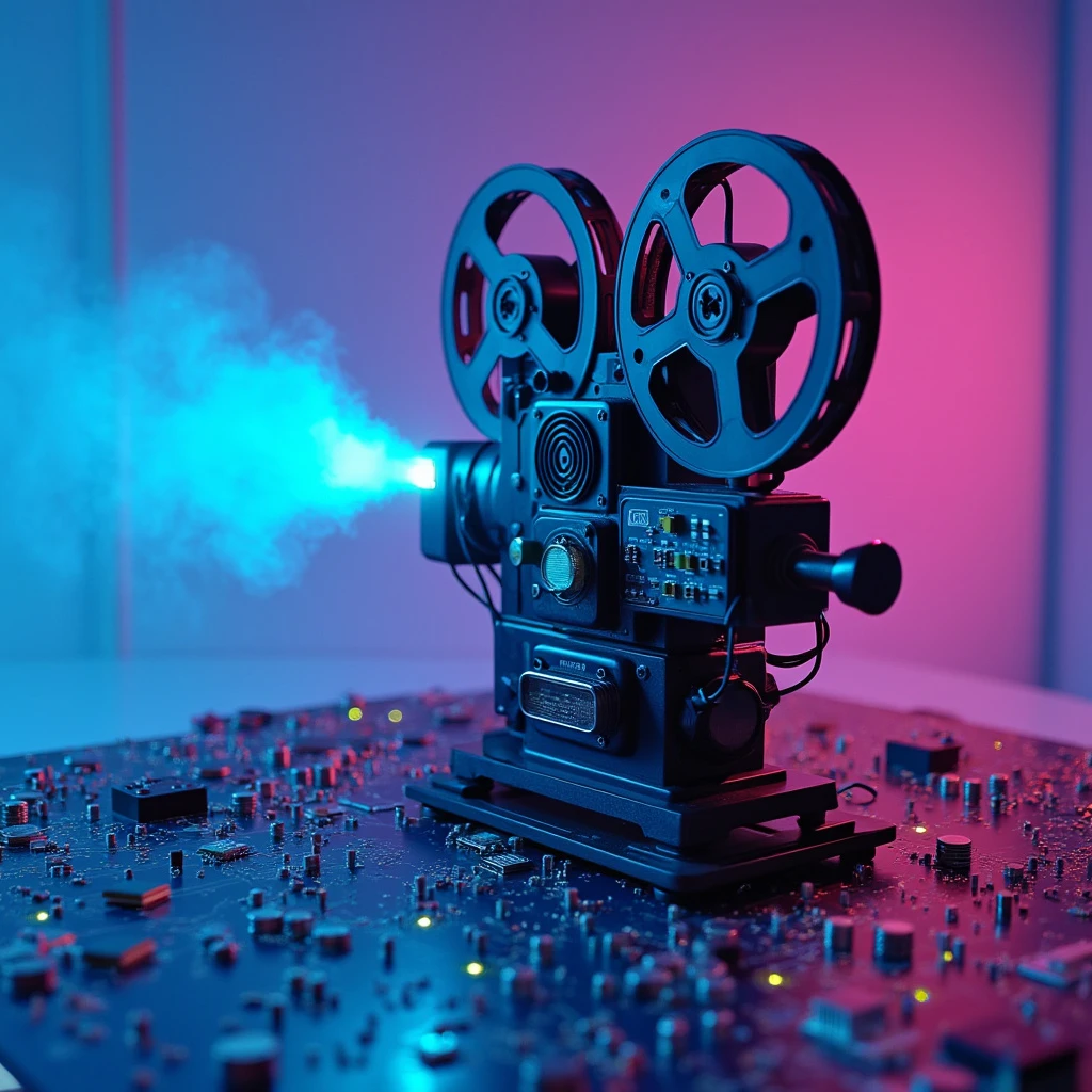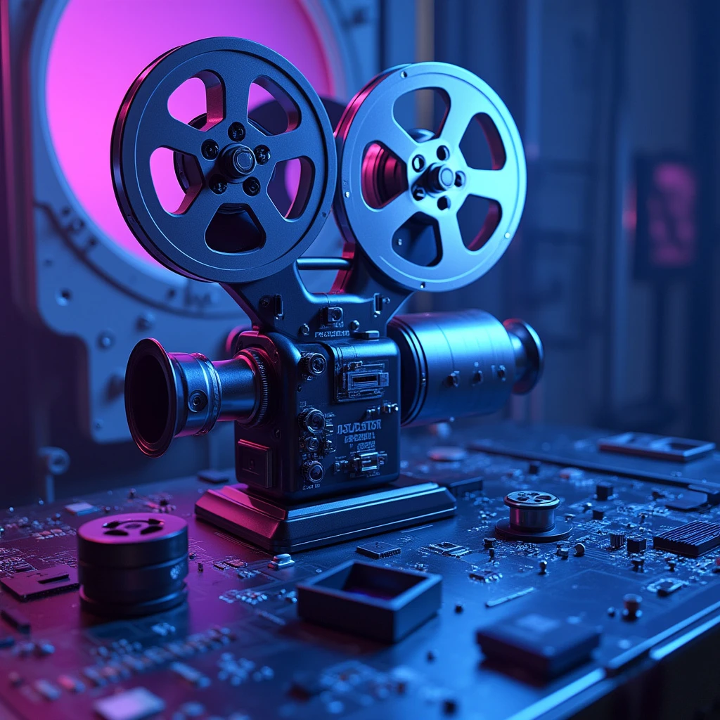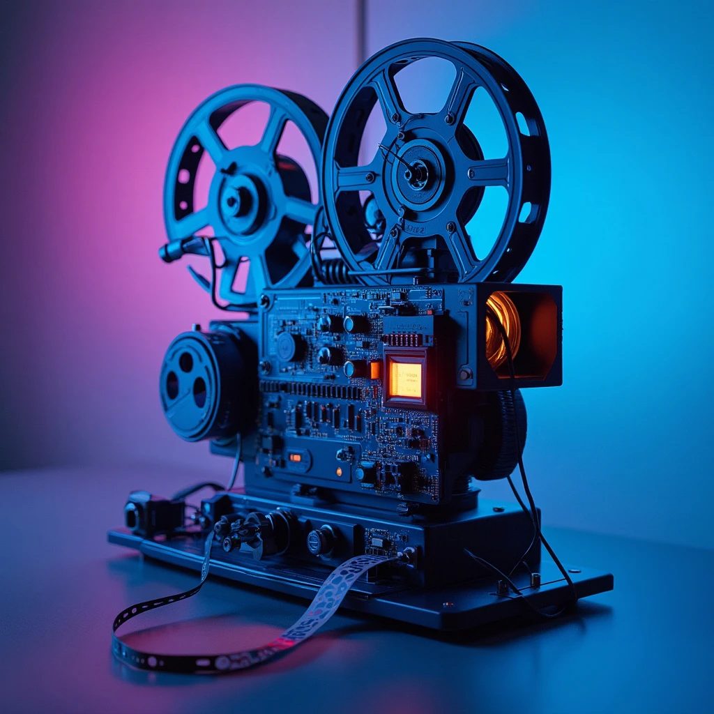 a movie projector with a blue and purple background and a circuit board with a movie reel on it, Edward George Handel Lucas, video art, filmic, computer graphics