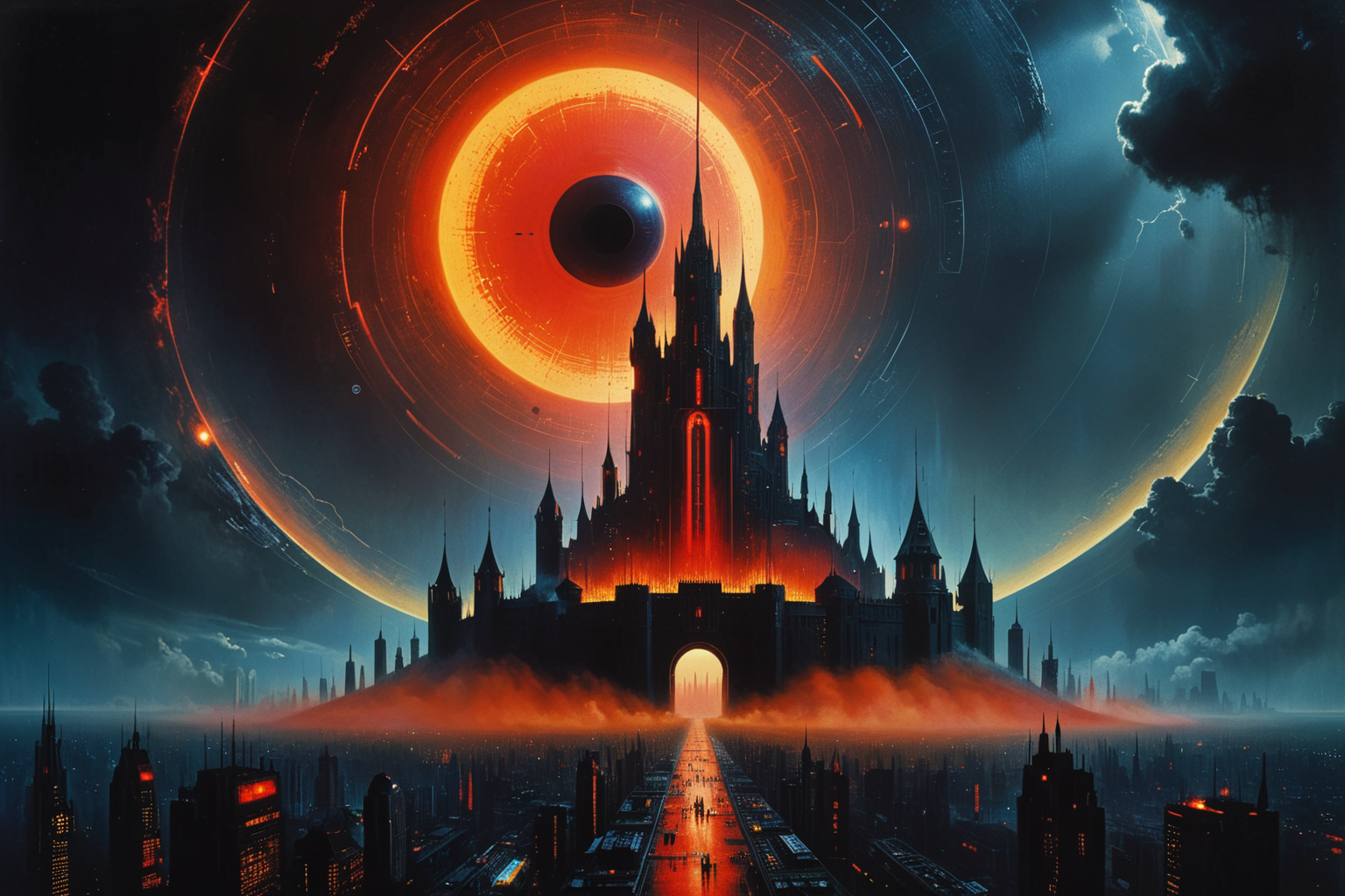 giant tall (sauron castle:1.2), in foreground, domination in the scene, towering, science fiction, cyberpunk, noir, futuristic, science fiction gothic, sci fantasy mix, neon, energy sparks, light particles, godrays, city in the year 2543, dark building, megastructure, skyline, best quality, high angle, dramatic contrast sky, fog, rain, hdr, cinematic, film grain, ridley scott, nihei tsutomu, Adolph Gottlieb, Seth Ickerman, mamoru oshii, John Howe, kandinsky wassily, (close-up:2), (zoomed:1.2), centered, perspective, vanishing point, epic scale, grandeur, colossal, primary colors, no gradients, red color guide, giant eye in sky,vast scenery, mesmerizing, outstanding, visionary, exquisite <lora:Kodak Motion Picture Film Style v5_2:0.6> Kodak Motion Picture Film Style <lora:CinematicStyle_v1:0.4> <lora:Neon_Noir_SDXL:0.5> mad-neon-noir <lora:RMSDXL_Creative:0.5> <lora:John Harris Style:0.45> John Harris Style page <lora:tbh287-sdxl:0.45>