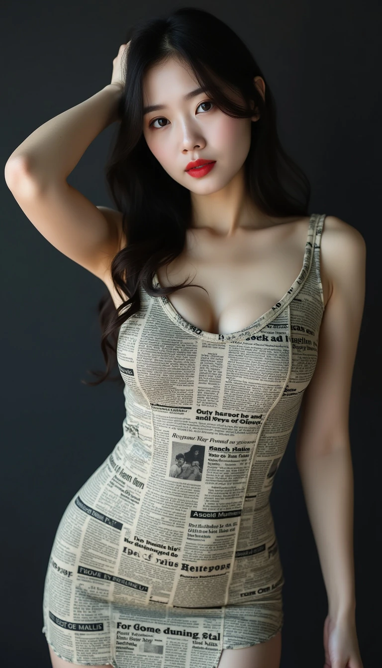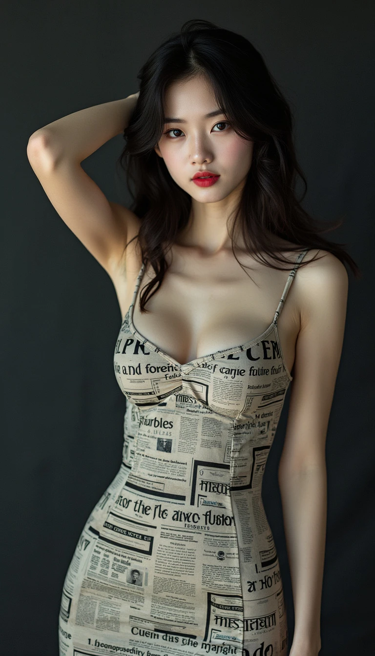 This is a high-resolution portrait of a modern style, featuring a young woman. She is wearing a tight dress printed with English and patterns, the pattern of which resembles a newspaper. Her hair is black, falling over her shoulders, and she has one hand resting on the back of her head while the other hangs naturally by her side. Her eyes are fixed on the camera, and her expression is calm. She appears to be between the ages of 20 and 30, slim in figure, with delicate features, and fair skin. Her eyes are brown, and her lips are tinted with a subtle shade of red lipstick. Her hair falls to her shoulders, with a deep brown color, styled in loose waves without bangs. The background is dark, giving a mysterious feel,Young Asian woman.