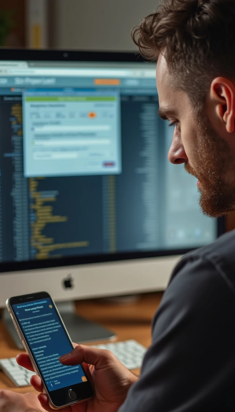 A man in front of a computer or cell phone screen, searching for mental health clinics and professionals, while expressing frustration at seeing long waiting lists and exorbitant prices in the descriptions of services