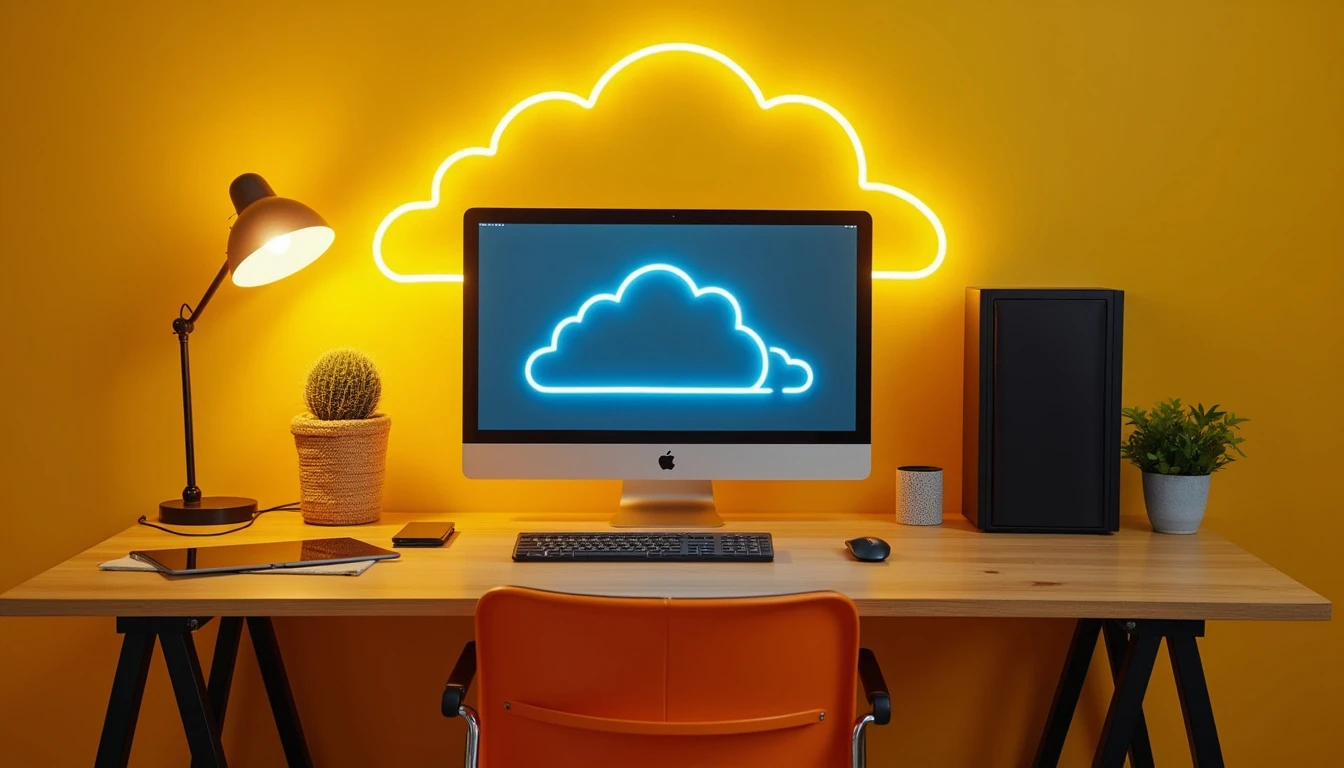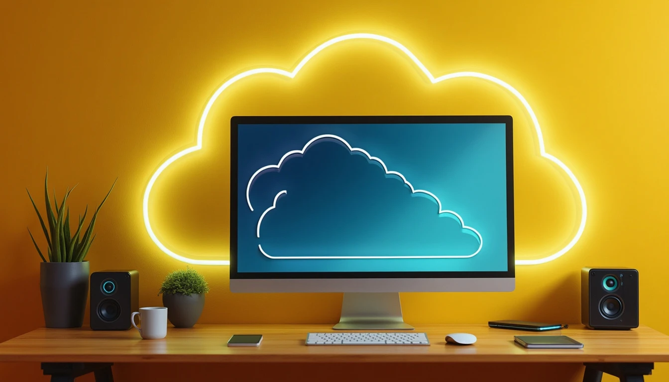 A desk with a computer system on it and a neon cloud storage space behind it. It is with neon lighting. Simple yellow background