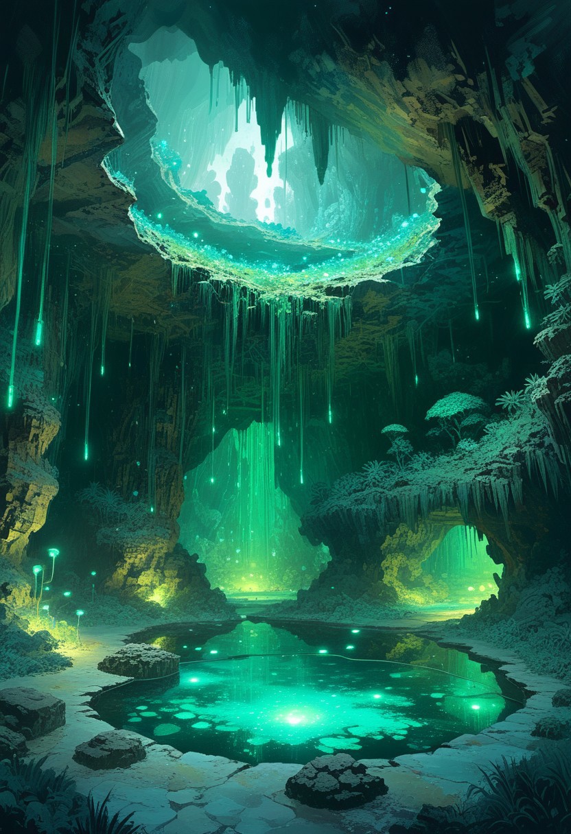 (by Ellen Jewett:1.5), (Bioluminescent Impressionism, topdown view to a bioluminescent cave, stalactites, stalagmites, deep cave, bioluminescent water pond, aztec ruins, torches, ethereal landscapes, deep green light, dynamic light, depth of field, biotech emotion:1.3) <lora:xl_more_art-full_v1:0.5> <lora:add-detail-xl:1> <lora:RMSDXL_Creative:2>