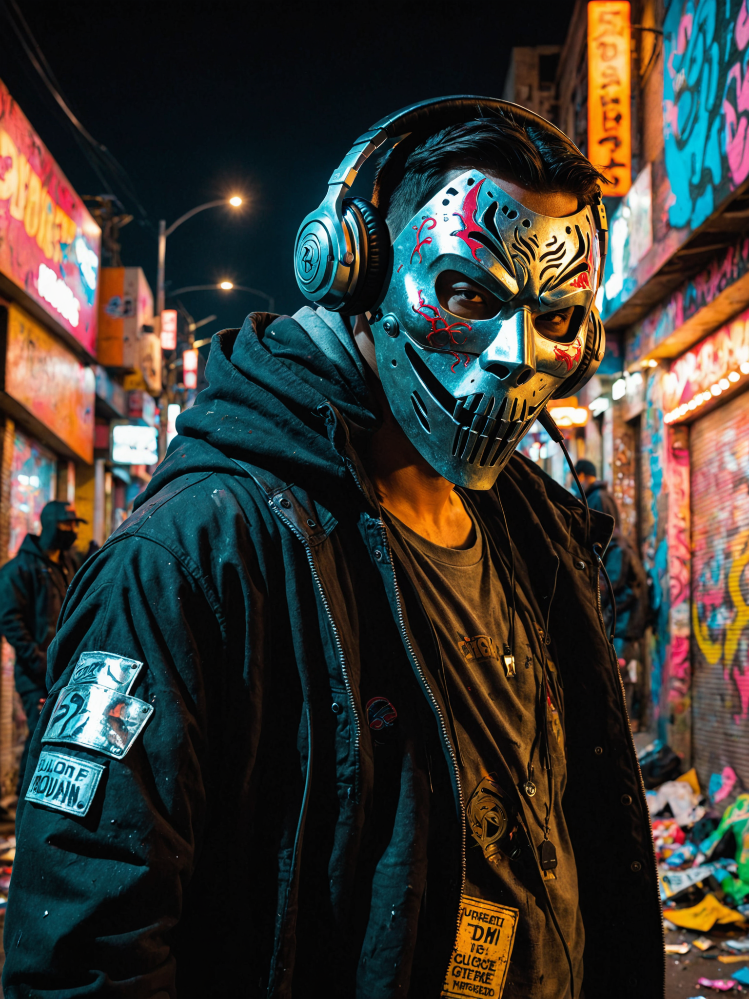 Dystopian city under siege during purge night. A close up shot of a person donning grotesque Halloween-inspired masks with high details and a headphone. The rioter wears a bright colored streetwear. A pair of sheathed katana visible behind his back while holding a shiny silver plated dual pistol with intricate engravings. The scene is lit by flickering street fires filled with burning cars, broken storefronts, and graffiti-covered walls, creating dramatic lighting contrasts across the cracked pavement and broken glass.