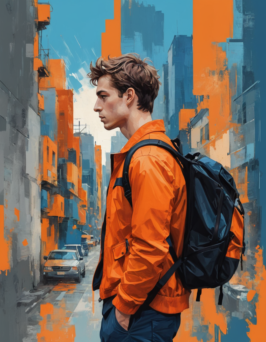 masterpiece, best quality, highly detailed, urban portrait, profile of a young man, wearing a vibrant orange jacket, carrying a black backpack, cityscape background, abstract and fragmented style, digital art, orange and blue color palette, modern artistic composition <lora:add-detail-xl:2>