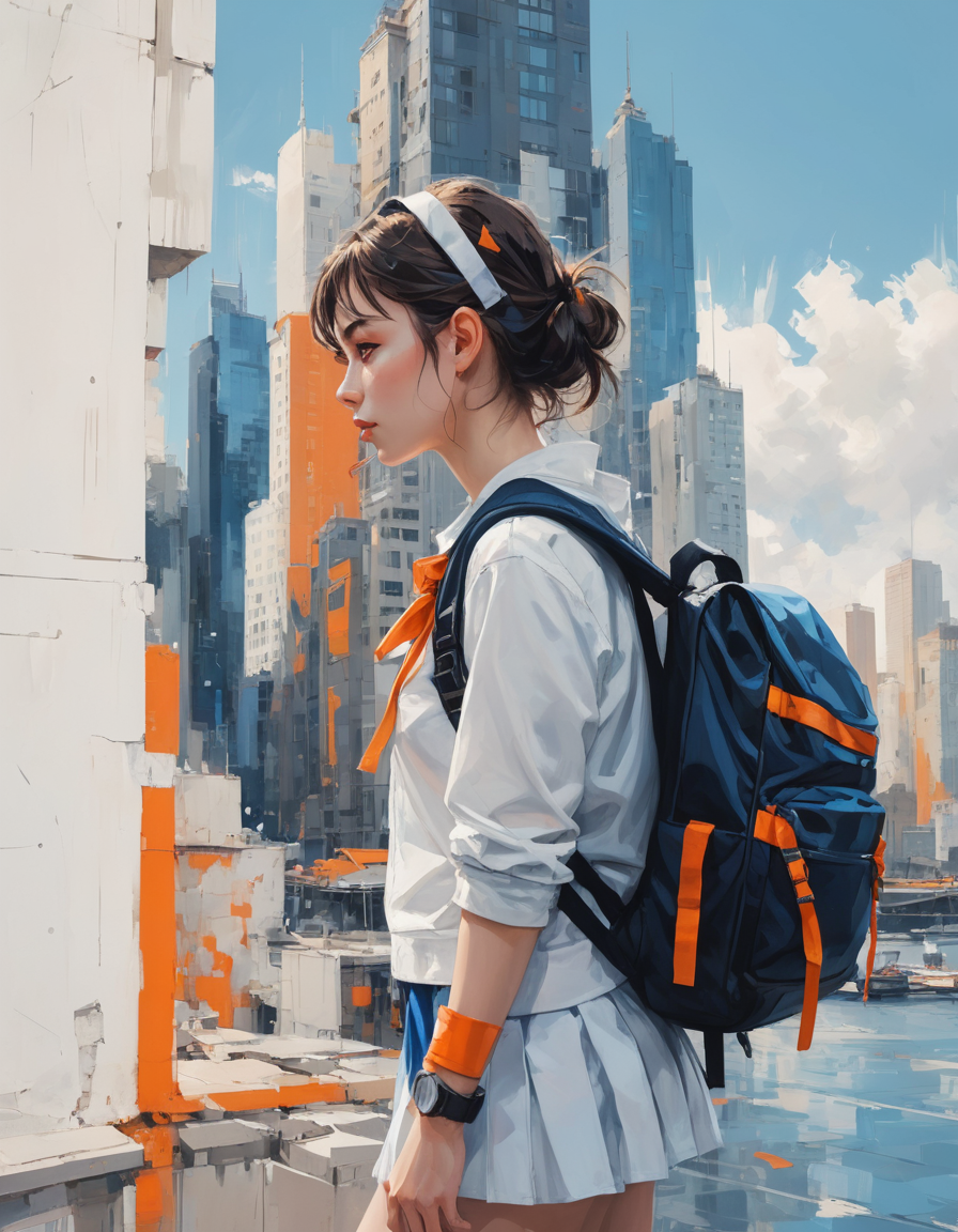 masterpiece, best quality, highly detailed, urban portrait, profile of a magical girl, wearing a sailor-style magical outfit with white and blue colors, carrying a black backpack, cityscape background with orange accents, abstract and fragmented style, digital art, blue, white, and orange color palette, modern artistic composition <lora:add-detail-xl:2>