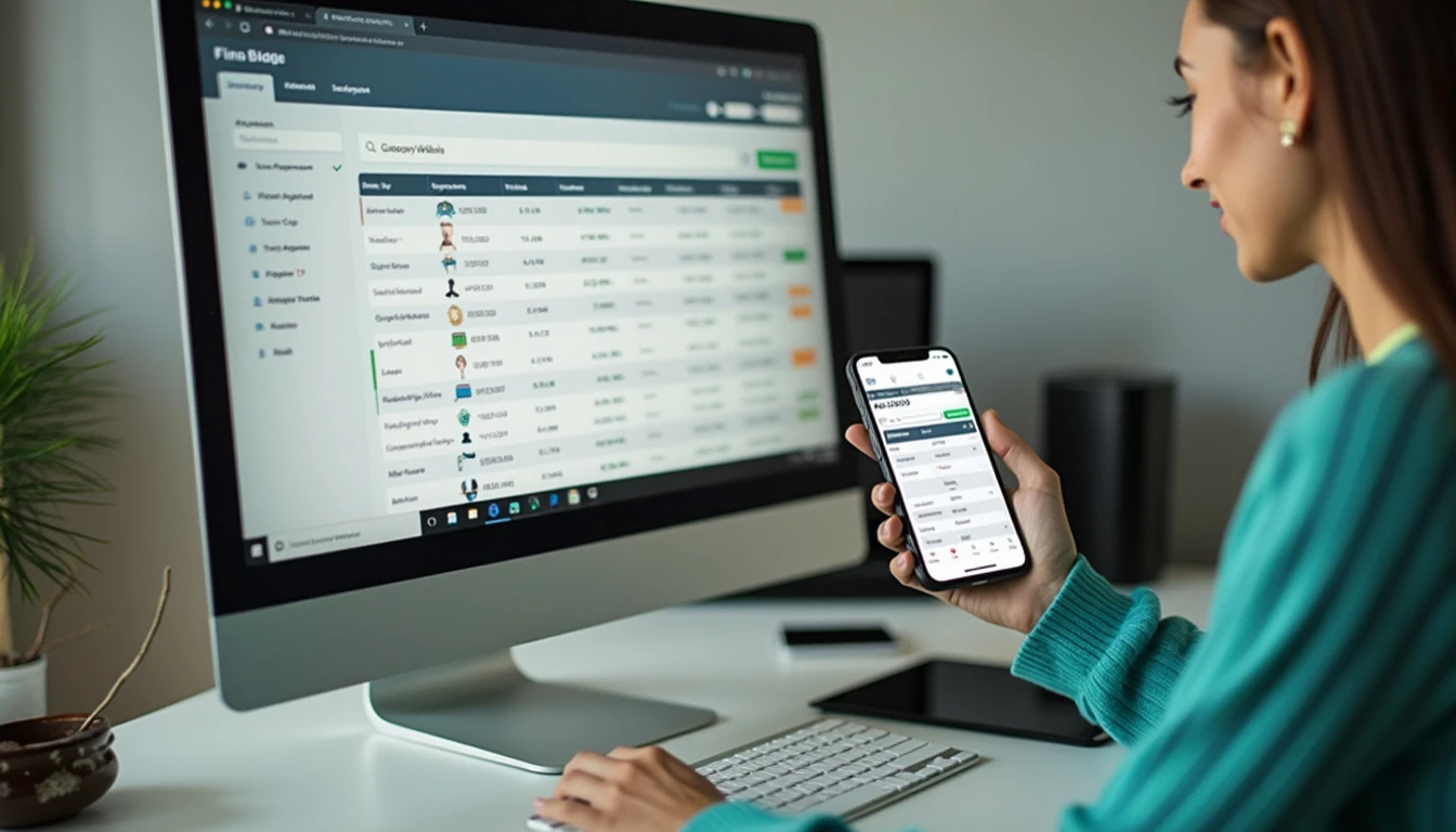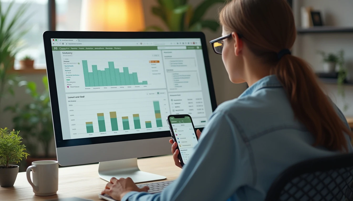 Create an image of a person sitting in front of a computer, checking their budget using a financial app. The screen displays various financial categories and budget summaries, with the person focused on managing their finances. The setting should feel modern and professional, emphasizing the use of technology for effective budgeting and financial planning