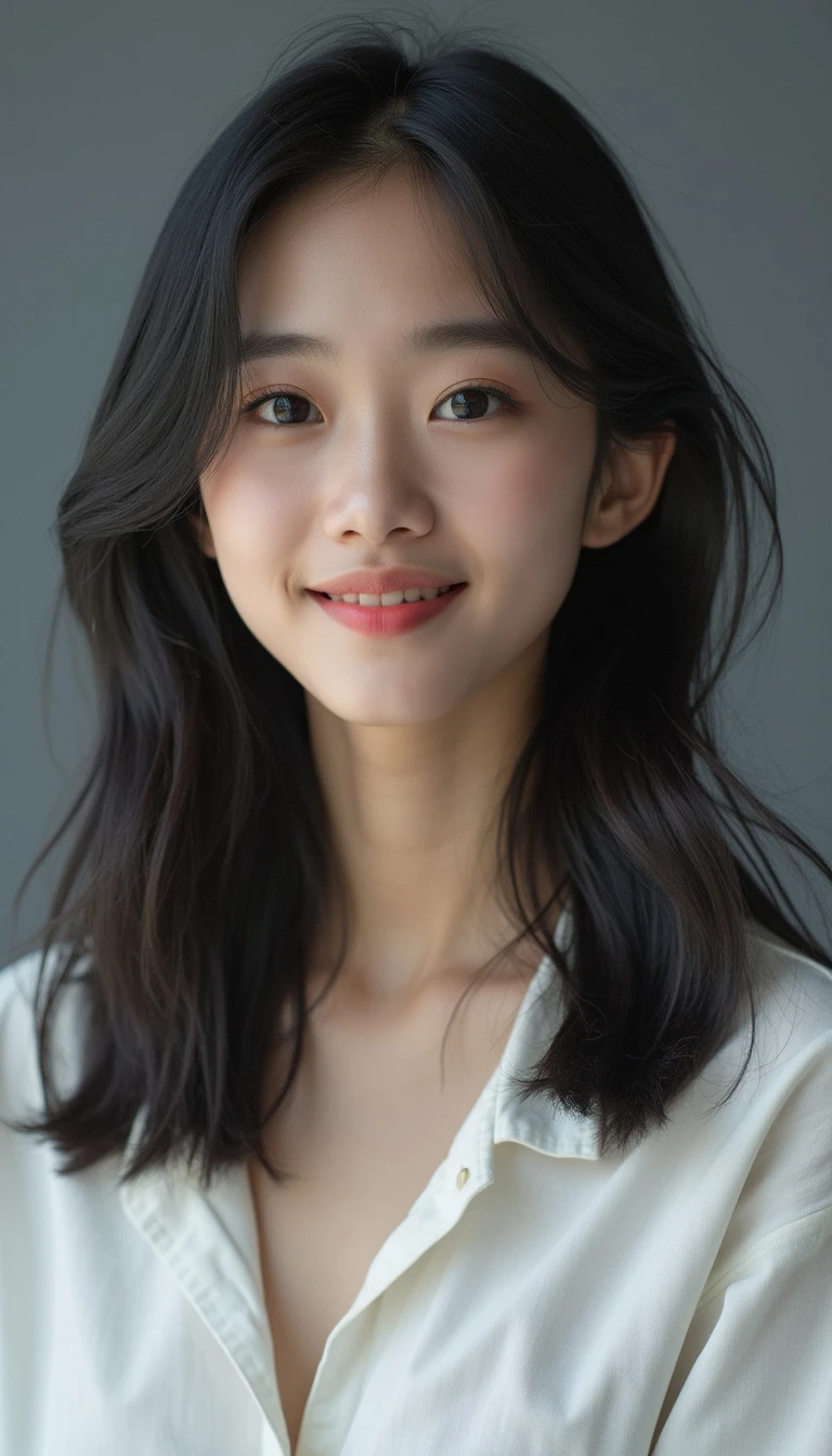The background of the image is a single deep gray tone, providing a smooth and unobtrusive backdrop that allows the viewer's attention to be fully focused on the person in the foreground. The subject in the picture is a young woman with shoulder-length hair, facing the camera; she is the focal point of this work. Her facial features are very delicate, with large bright eyes, long eyelashes, soft eyebrows, and a gentle smile. Her skin looks very smooth and flawless, her lips natural with a touch of soft pink. She has long straight black hair that falls naturally downwards, with some strands gently covering her left shoulder. She is wearing a simple white shirt with an open collar that adds an informal yet elegant feel. The woman's posture faces directly towards the camera with her head slightly tilted; her expression is gentle yet confident, and her body language shows an open and friendly attitude. The entire image presents a modern and fresh feeling; the lighting is soft and even which highlights both her facial features and clothing details. Overall, this photo conveys an atmosphere of tranquility and harmony.