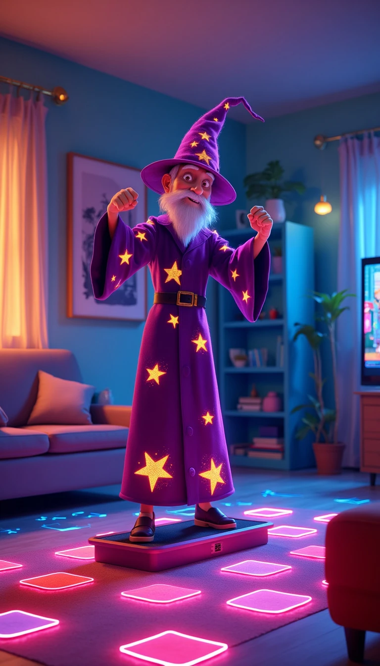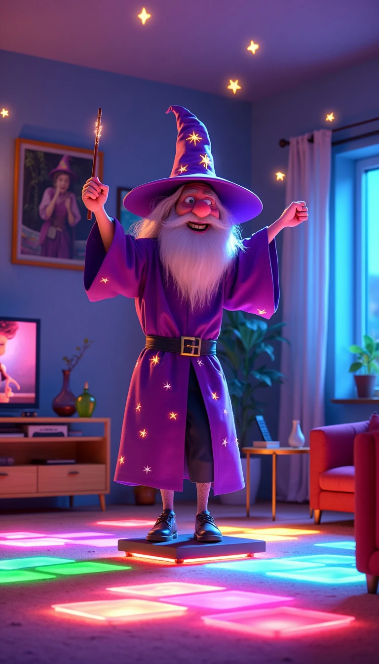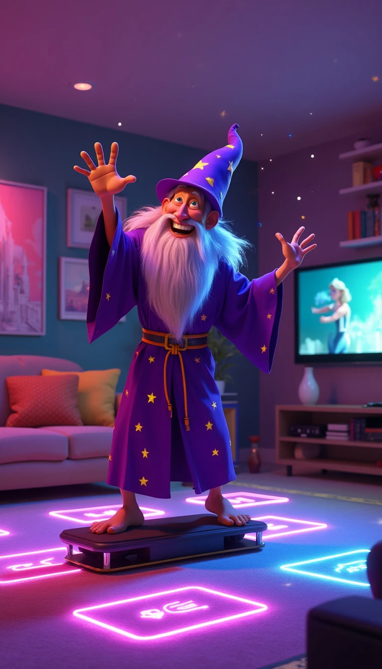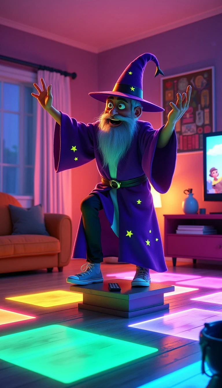 CREATE A PIXAR-STYLE IMAGE PROMPT OF A WIZARD TAKING A NEON-STYLE STEP CLASS IN A HOUSE Here's an image prompt depicting a wizard taking a step class in a Pixar-style neon-lit living room: "A fun, animated Pixar-style scene featuring a wizard taking a step class in a vibrant, neon-lit living room. The wizard is a charismatic character with Pixar's signature exaggerated features—a pointy nose, big, expressive eyes, and a wide, determined smile. He wears a traditional wizard's robe, but in bright neon colors—electric purple with neon yellow stars. His pointy hat bobs comically as he works out. The wizard stands on a step, mid-energetic movement, with his arms raised and one leg raised. Little beads of sweat shaped like glittering stars fly around him. The living room is a charming mix of elements magical and modern. Ordinary furniture like a sofa and an armchair float lightly above the floor. A magic wand rests next to a remote control on the coffee table. The walls of the room are decorated with animated paintings that change scenes, emitting a soft glow in pastel tones. A bookshelf in the background has tomes that glow in different neon colors. The floor of the room looks like a dance floor, with squares that light up in neon colors - pink, blue, green and yellow - in sync with the wizard's movements. Around the wizard, magical objects like potions, crystals and a cauldron emit a soft neon glow, creating a surreal and enchanting environment. A flat-screen TV on the wall shows an animated fitness instructor, also in Pixar style, guiding the steps. The overall lighting of the scene is dramatic, with neon spotlights creating long, colorful shadows, giving the scene a magical and energetic atmosphere.