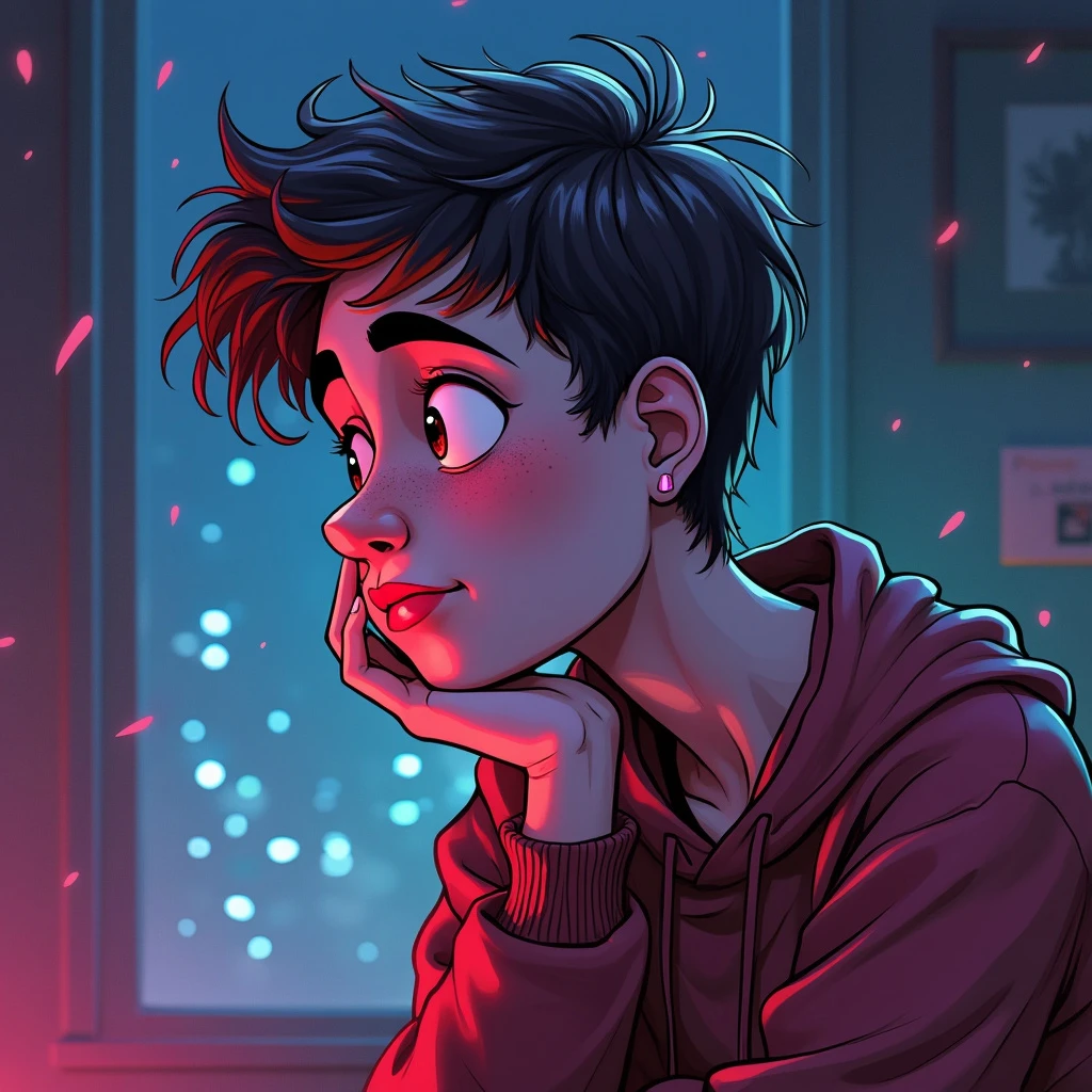 in a drawing of a thoughtful person in pixar style and neon effect