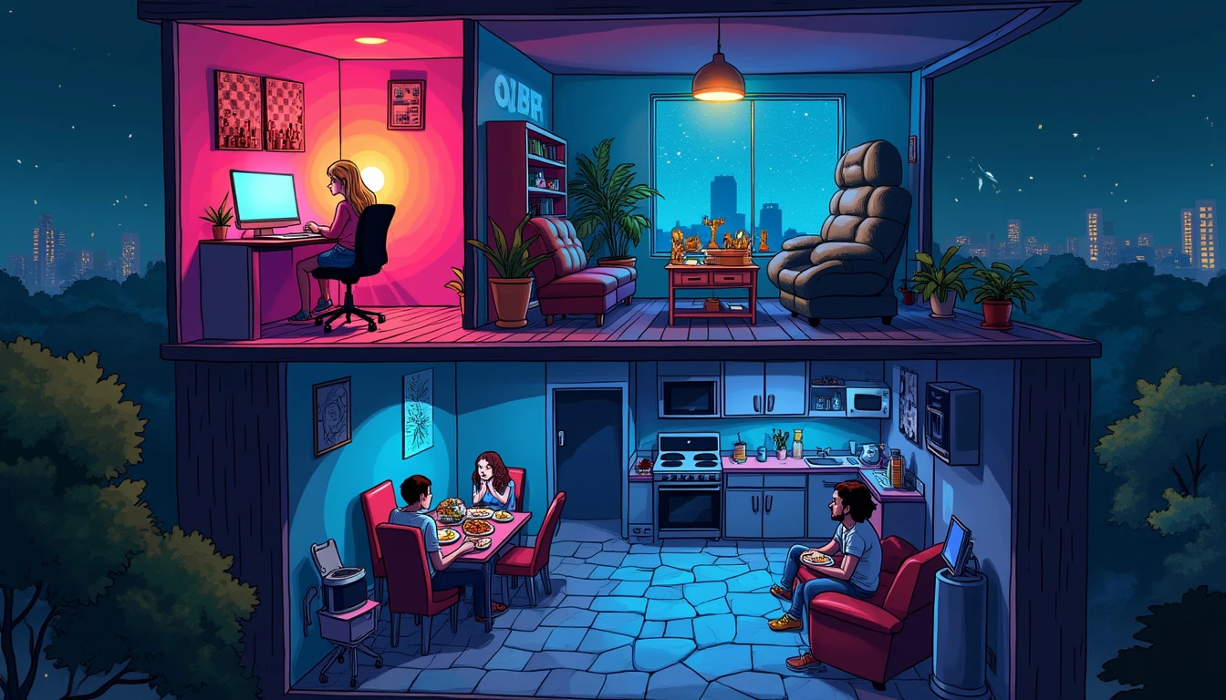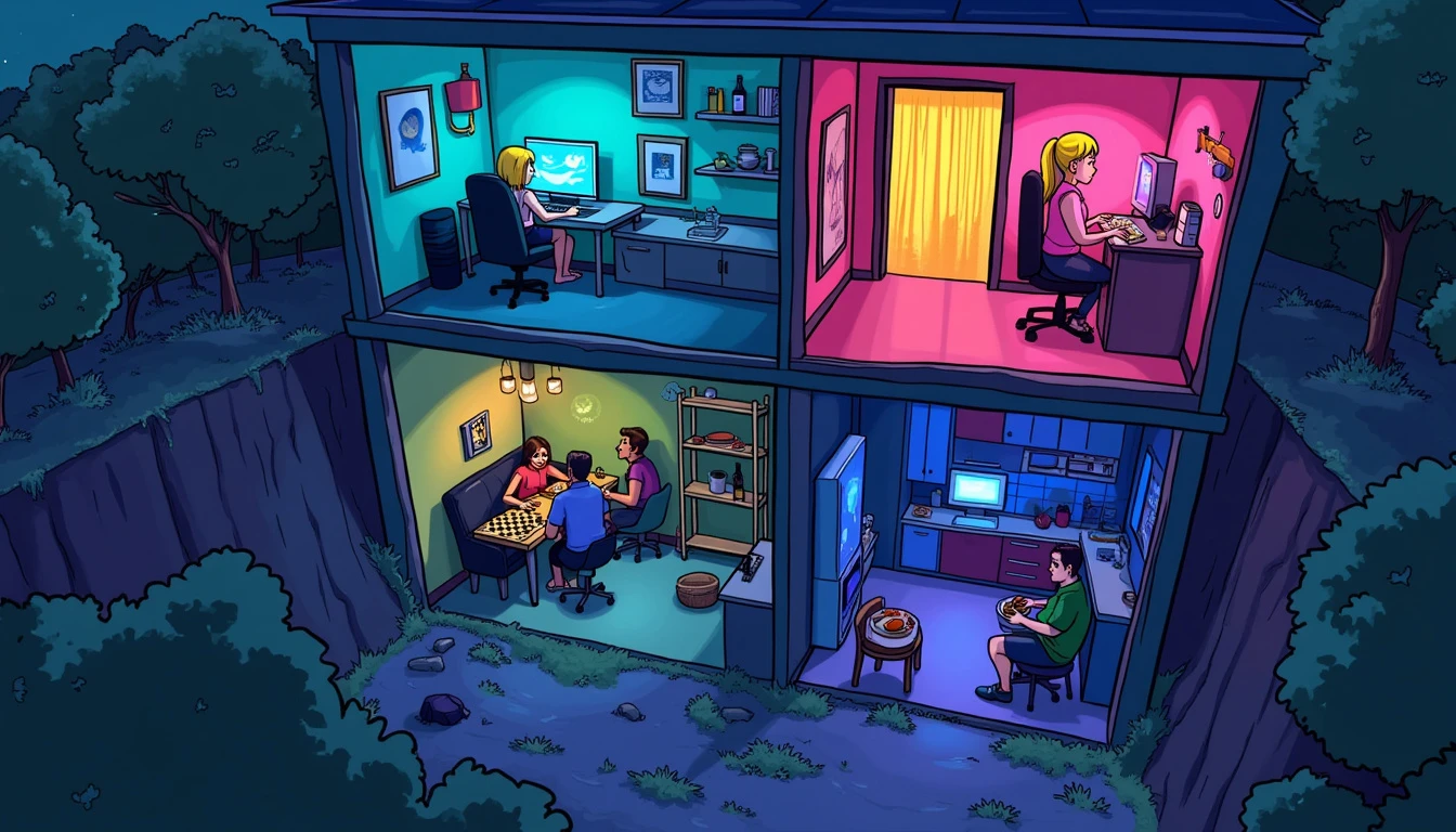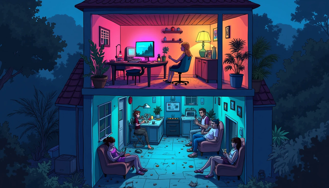 "A nighttime wide shot from a high angle looking down at a house with see-through walls and floors, drawn in a cartoon/animated style. A young blonde woman is the only one upstairs, seated at her computer, streaming chess in a single vibrant room filled with neon lights and modern decor, creating a dynamic and engaging atmosphere. Below, in a single large, dimly lit underground cellar, three people are locked in amongst broken furniture, looking miserable. They sit together eating food in silence, while a brunette woman cooks in a cramped corner kitchen. The stark contrast between the lively, colorful streaming room and the bleak, dreary basement is emphasized with bold colors and expressive cartoon-style characters."