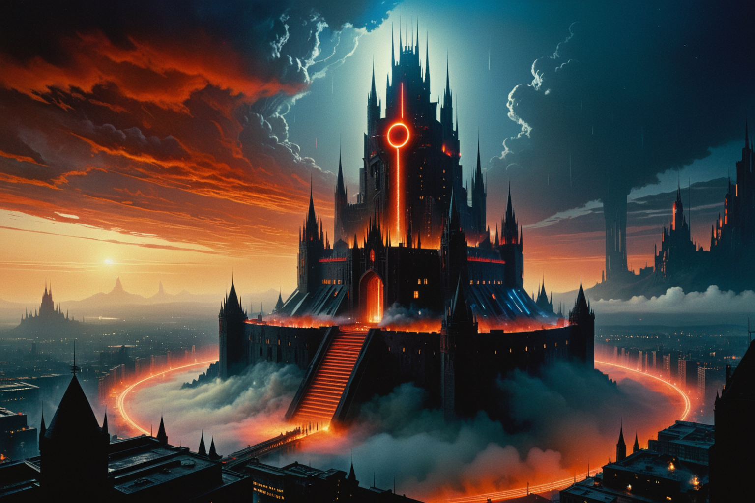 giant tall (sauron castle:1.2), in foreground, domination in the scene, science fiction, cyberpunk, noir, futuristic, science fiction gothic, sci fantasy mix, neon, energy sparks, light particles, city in the year 2543, dark building, megastructure, skyline, best quality, high angle, dramatic contrast sky, fog, rain, hdr, cinematic, film grain, ridley scott, nihei tsutomu, Adolph Gottlieb, Seth Ickerman, mamoru oshii, John Howe,kandinsky wassily,(close-up:1.8), (zoomed:1.2), epic scale, grandeur, colossal, primary colors, no gradients, red color guide, giant eye in sky, mesmerizing, outstanding, visionary, exquisite <lora:Kodak Motion Picture Film Style v5_2:0.6> Kodak Motion Picture Film Style <lora:CinematicStyle_v1:0.4> <lora:Neon_Noir_SDXL:0.5> mad-neon-noir <lora:RMSDXL_Creative:0.5> <lora:EldritchCandids1.1.2:0.45> <lora:John Harris Style:0.45> John Harris Style page <lora:d\EnvyZoomSliderXL01:1>