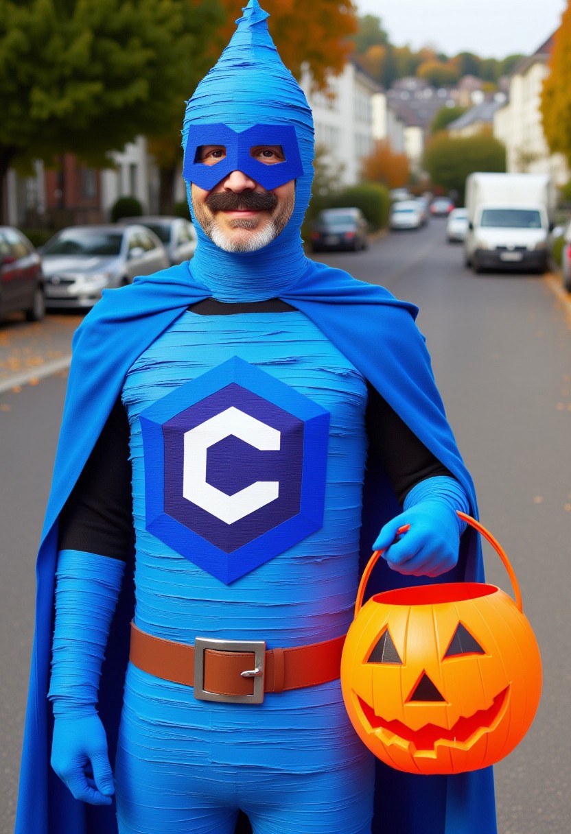 This photograph captures a man dressed in an elaborate, homemade costume inspired by the Civitai man character. The man is standing outdoors on a residential street, dressed in a blue costume made entirely of blue paper pieces, meticulously arranged. The costume features a large, blue cape with a civitaiLogo on the chest, made from paper. The man has a blue mask covering his face, also made from paper, with a pointed helmet and a mustache drawn on. The person holds a small, orange pumpkin bucket in its right hand, which features the word "moderator" on it.