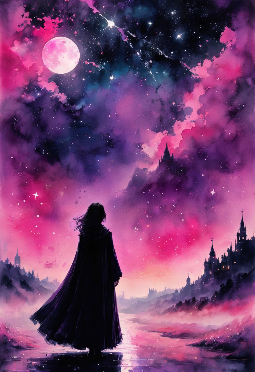 woman wrapped in a black cloak, a dreamy purple pink starry sky, absurd world in the style of ink, acrylic and watercolor, detailed matte painting in Klimt and Jeremy Mann style, deep color, fantastic, intricate details, splash screen, complementary colors, fantasy concept art, 8K resolution trending on Artstation Unreal Engine 5, best quality, ultra-detailed, very aesthetic, illustration, perfect composition, intricate details, absurd, atmospheric lighting, streaks of light Masterpiece, vibrant colors, very detailed, midjourneyv6.1, detail background, dark, chiaroscuro