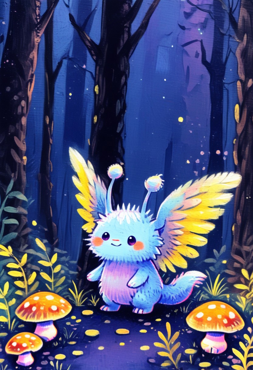 novuschroma style cartoon drawing of a adorable weird creature in a odd looking place, the creature has a long tail and feather ((wings)), mushrooms grow on the ground,, urban city forest background, confusing, night and day, pastel colors