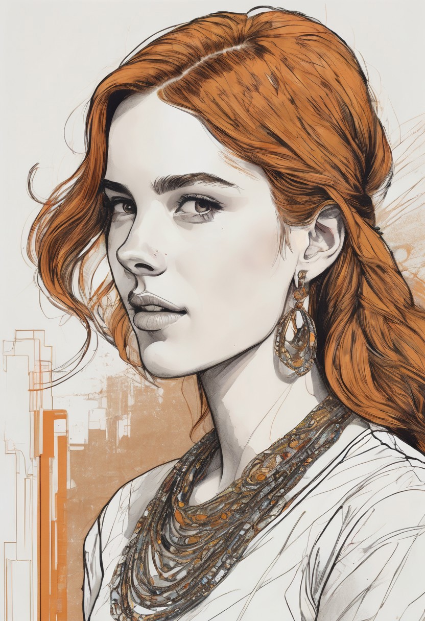 graphic novel flat colors style, cropped detail, fine intricate lineart, hatched shadows, amazing textures, insane details, intricate details,sharp focus, (portrait of an alluring Dutch woman, light smile, freckles, brown hair, long hair, a black and white white t-shirt). capturing fashion-forward visuals, creating visual impact,evoking emotion,pushing creative boundaries, necklace, earring, small breast, the background describes an art museum in Amsterdam