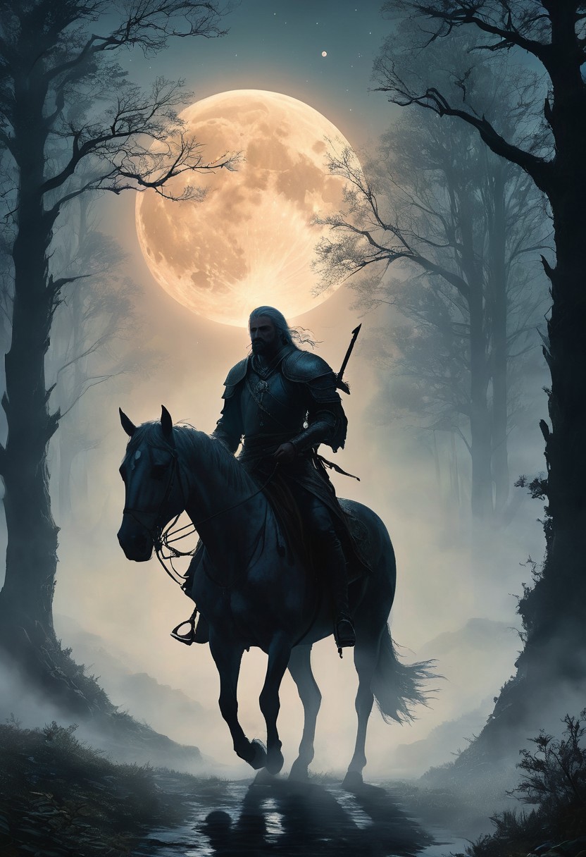 In the tranquil moonlit night, a lone Witcher rides through the ancient forests of the Continent. His silhouette is stark against the silver glow of the full moon, his form outlined by the ethereal light. The dense woods whisper ancient secrets as his horse treads through the mist-covered pathways. His eyes, keen and watchful, scan the shadows for any sign of danger. Behind him, the moon hangs low, casting its soft light over the medieval landscape, illuminating the towering trees and the winding path ahead. The air is thick with magic, and the night holds both mystery and danger in equal measure. vibrant, beautiful, translucent, intricate, detailed, many details, extreme detailed, full of details, Wide range of colors. Dramatic,Dynamic,Cinematic,Sharp details, Insane quality. Insane resolution. Insane details. Masterpiece. 32k resolution.