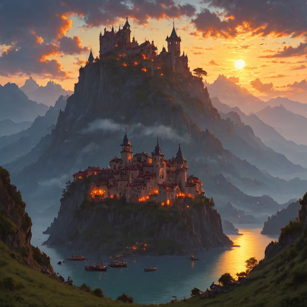 Best quality, masterpiece, high detailed, fantasy illustration, soft lights, Style by Ghibli, cinematic, epic, early morning, European village, beautiful sky with large clouds, birds flying overhead, fishermen getting ready to ship out, sun on the horizon, Great Castle up on mountain