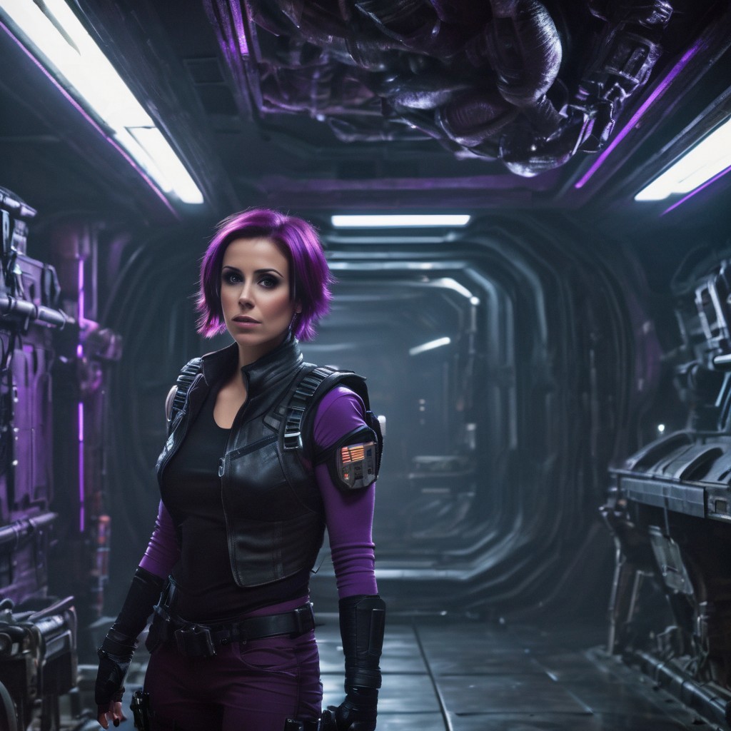 beautiful Alyssa Milano as a space bounty hunter, tight leather pants, sleeveless top, , 25 years old, short spiked purple hair, holding a large sci-fi rifle, BREAK space ship interior, cargo hold, steam, emergency lighting, dark, sinister