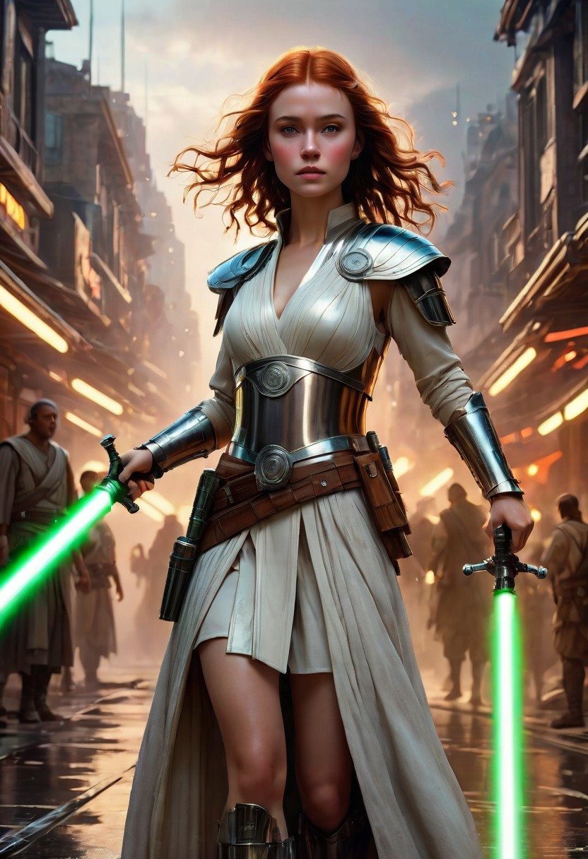 High resolution ultra-realistic of Beautiful Jedi Knightess, 8k, capturing the intensity of the moment, cinematic lighting, standing on a bloody and stormy battlefield in bloody battle, wavy red hair, realistic dirty pale face, realistic brown eyes, beautiful hourglass figure, burning in a Star Wars Town, intricately designed dirty white Jedi robes, Star Wars Aesthetic, perfect athletic figure, beautiful Sadie Sink as Jedi Knightess, ultra realistic, cinematic style, vigorous and seductive, athletic figure, Star Wars style, dramatic lighting, wet and sweaty skin, dirty skin, athletic figure, dark fantasy, dramatic lighting, Greg Rutkowski style, Jedi Knightess on in Jedi dress, hyper-detailed, hyper-realistic, natural light, extremely intricate details, masterpiece, epic, bright colours, Attractive 21 old years girl, Attractive, beautiful firm Breasts, sharp focus, digital painting, Photograph Taken on Nikon D750, Alphonse Mucha, 8K, athletic figure, Hyperdetailed, hyperrealism, Attractive, Attractive bust girl, asymmetric balance