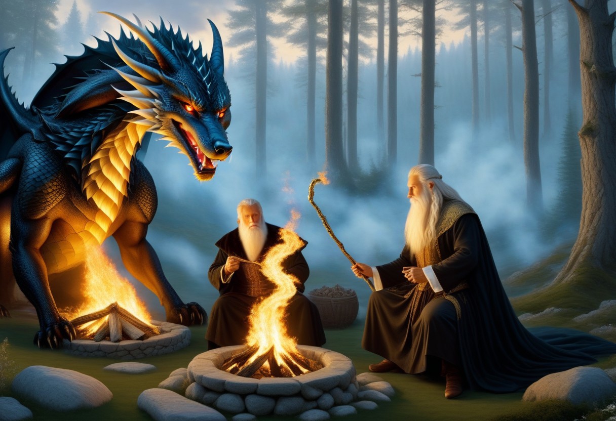ultra realistic image with high resolution and stable focus correct and accurate anatomy, correct and accurate objects, perfect detail, ultra realism, photo realism, an image depicting a magician, a dtsrec with a long beard and white long hair leaning on his magic wand standing next to a hearth in which a magical fire burns in front of his stone house merges with the forest landscape, next to him there is 1 huge dragon staring into the fire, at the feet of the magician lies a meekly huge white wolf. ultra detail