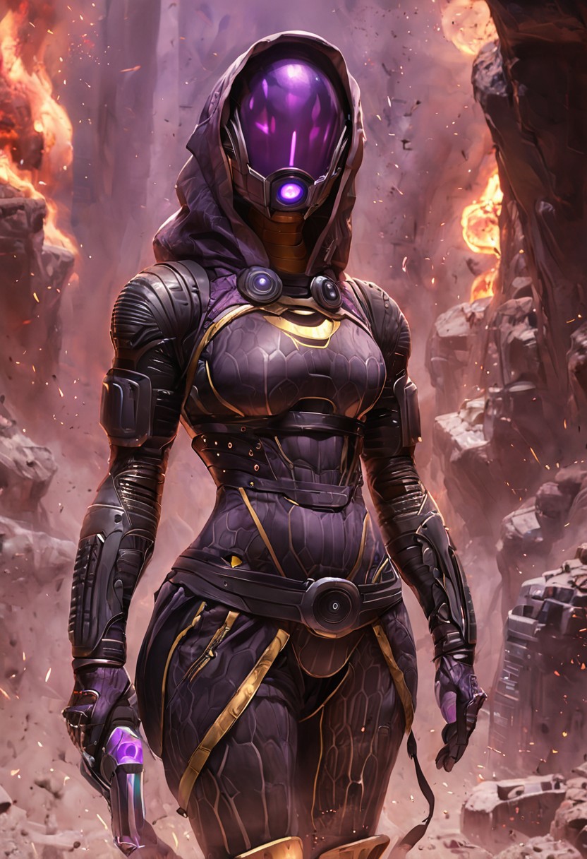 1girl, zavy-tali, alien, hooded, helmet, visor,exosuit, multicolored exosuit, black bodysuit, purple bodysuit, honeycomb print, leg armor, mask-on, hkstyle, curvy, wide hips, three fingers, two toes, axe kick, kicking, standing on one leg, leg up, high kick, standing split