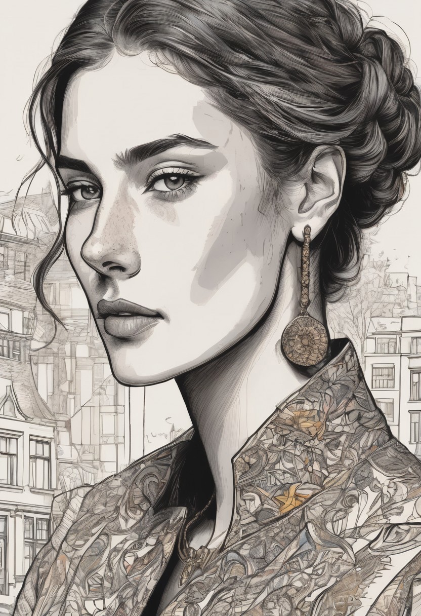 graphic novel flat colors style, cropped detail, fine intricate lineart, hatched shadows, amazing textures, insane details, intricate details,sharp focus, (portrait of an alluring Dutch woman, light smile, freckles, brown hair, long hair, a black and white white t-shirt). capturing fashion-forward visuals, creating visual impact,evoking emotion,pushing creative boundaries, necklace, earring, small breast, the background describes an art museum in Amsterdam