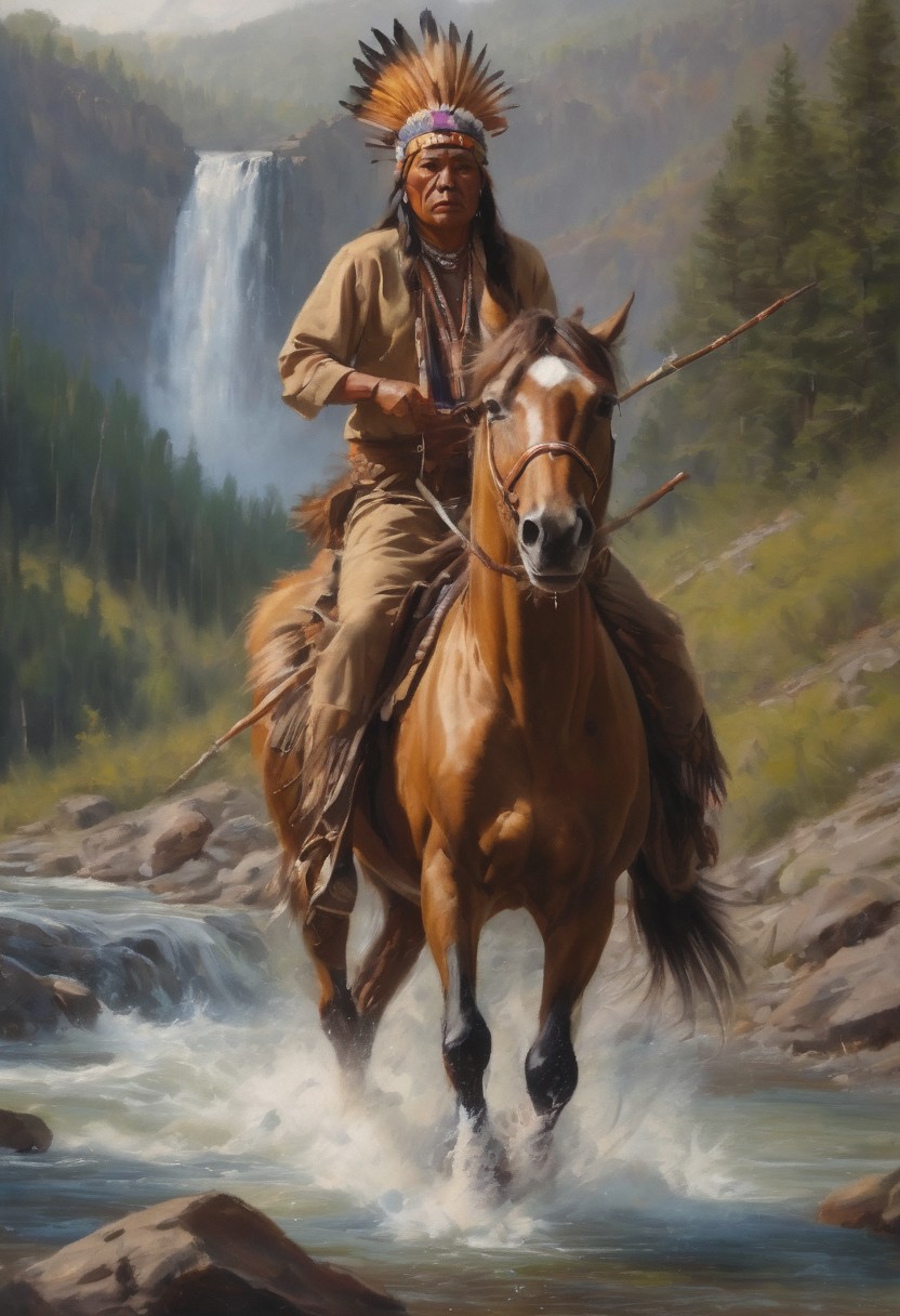 oil painting, realism, 1native american is crossing a deep river on his pony, mountains and a waterfall in the background, warm sunlight, beautiful scenery, peaceful, full body, handsome face, war bonnet, realistic, realism, detailed oil painting style, contrast, visible brush strokes
