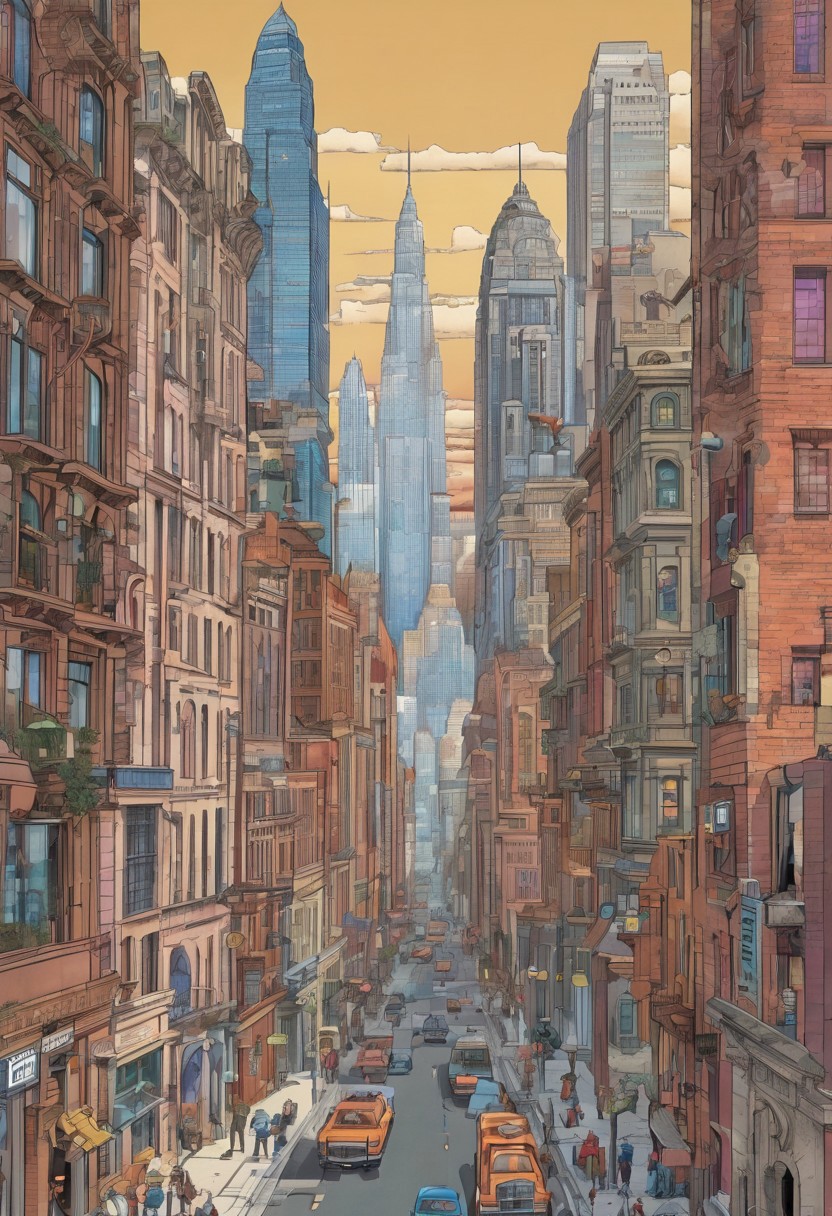 A comic-style illustration in the expressive linework of Todd Nauck with Richard McGuire's visual metaphor for time. The scene features a bustling futuristic cityscape with modern skyscrapers, futuristic habitats, and Victorian-era parks. Ancient ruins overlap the architecture, creating a collage of different historical periods. Windows, mirrors, and doorways act as portals through time, showing simultaneous moments across centuries. The characters are cartoonish, drawn with exaggerated expressions and dynamic poses, walking between time periods seamlessly. Fading colors represent the passage of time, with subtle transitions from vibrant hues to muted tones as eras blend together. Overlapping elements, detailed architecture, and a surreal ambiance of layered history.