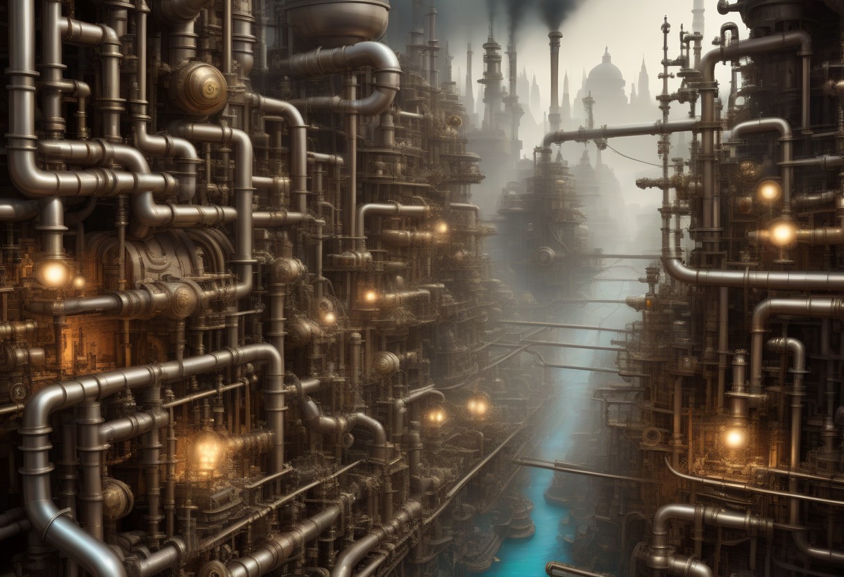 SteamPunk, an endless maze of valves and pipes creating a labyrinthe landscape underneath a bustling city, steam, close-up