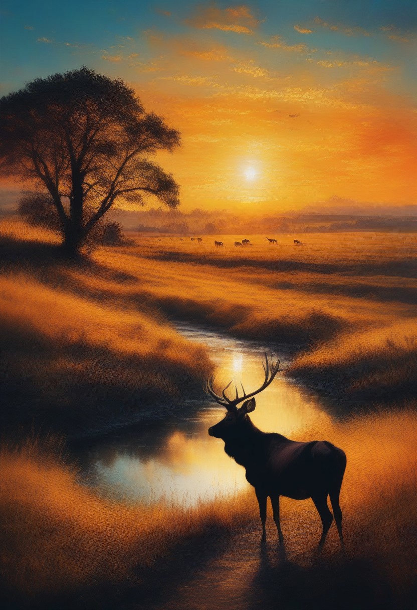 Nature, grasslands, sun, sunset, silhouettes of animals, ( from above), double exposure, realistic, captivating, fantastical, splash art, intricately detailed, hyper detailed, maximalist style, photorealistic, concept art, harmony, serenity, calm, mysterious glow, dynamic lighting, masterpiece, superb composition, finest details, highest aesthetics, strong muted highlighter, mystical glow, best quality, sharp focus, high contrast, colorful, ultra quality, 8k, best quality, midjourney-style