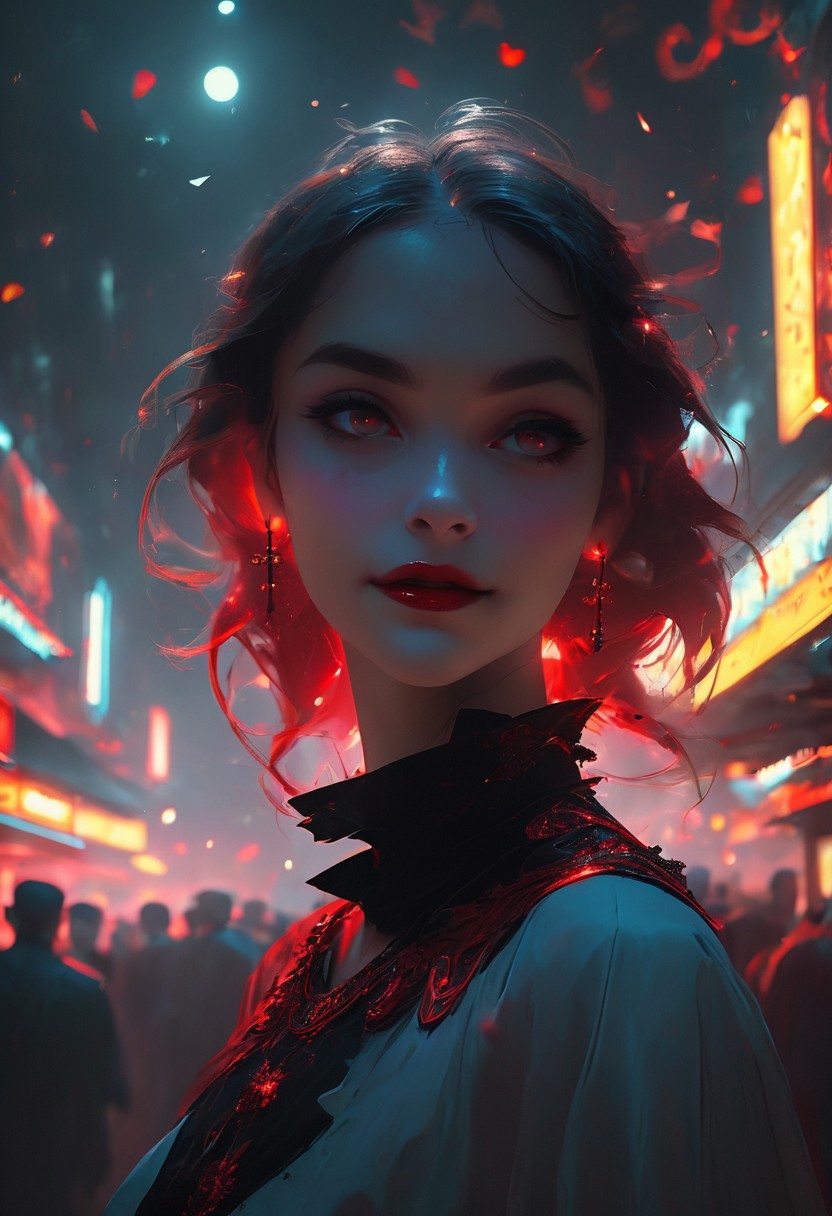 score_9, score_8_up, score_8_up, ((Cinematic composition)),((masterpiece)), (resplendent lighting), absurdres, very fine detail, 8k. (1girl, beautiful vampire walks out of a busy club into the night((full body))), summoning her magics, glowing light swirl in orbit around her, sly smile. Ominous and dangerous atmosphere. Resplendent spotlight highlighting, cinematic composition and lighting. Masterpiece.