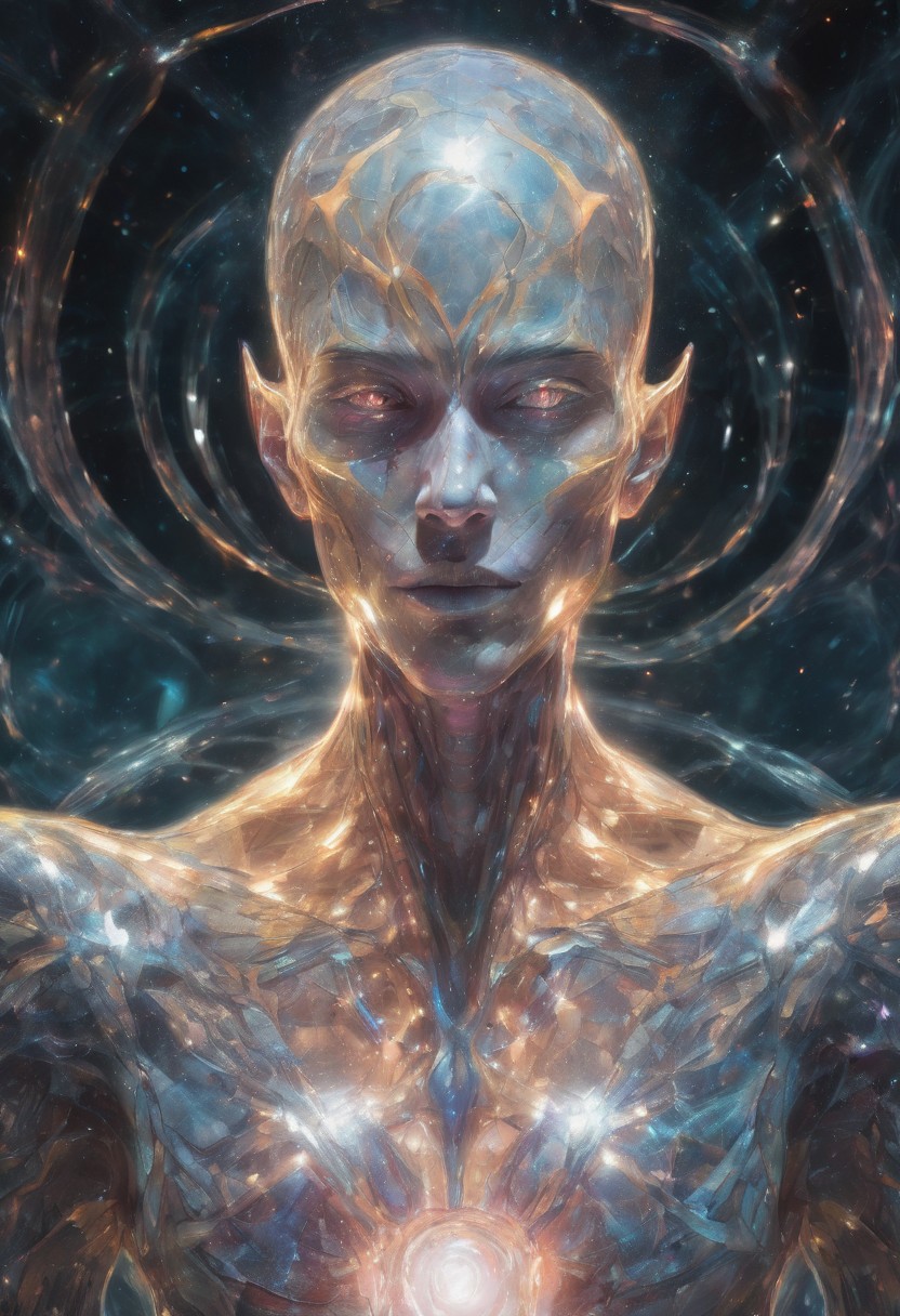 A close-up portrait of a glowing, crystalline humanoid figure with translucent skin and shimmering veins of light flowing beneath the surface. The figure's eyes are empty voids of light, and their body is adorned with thin, glass-like armor that refracts light into prismatic colors. The face is androgynous, with sharp, otherworldly features, and the hands are elongated, ending in delicate, claw-like fingers. The image captures the figure's upper body, with light bending and distorting around them as if they are standing in a dimensional rift. The background is a vortex of shifting light and shadow, creating a sense of tension and disorientation.