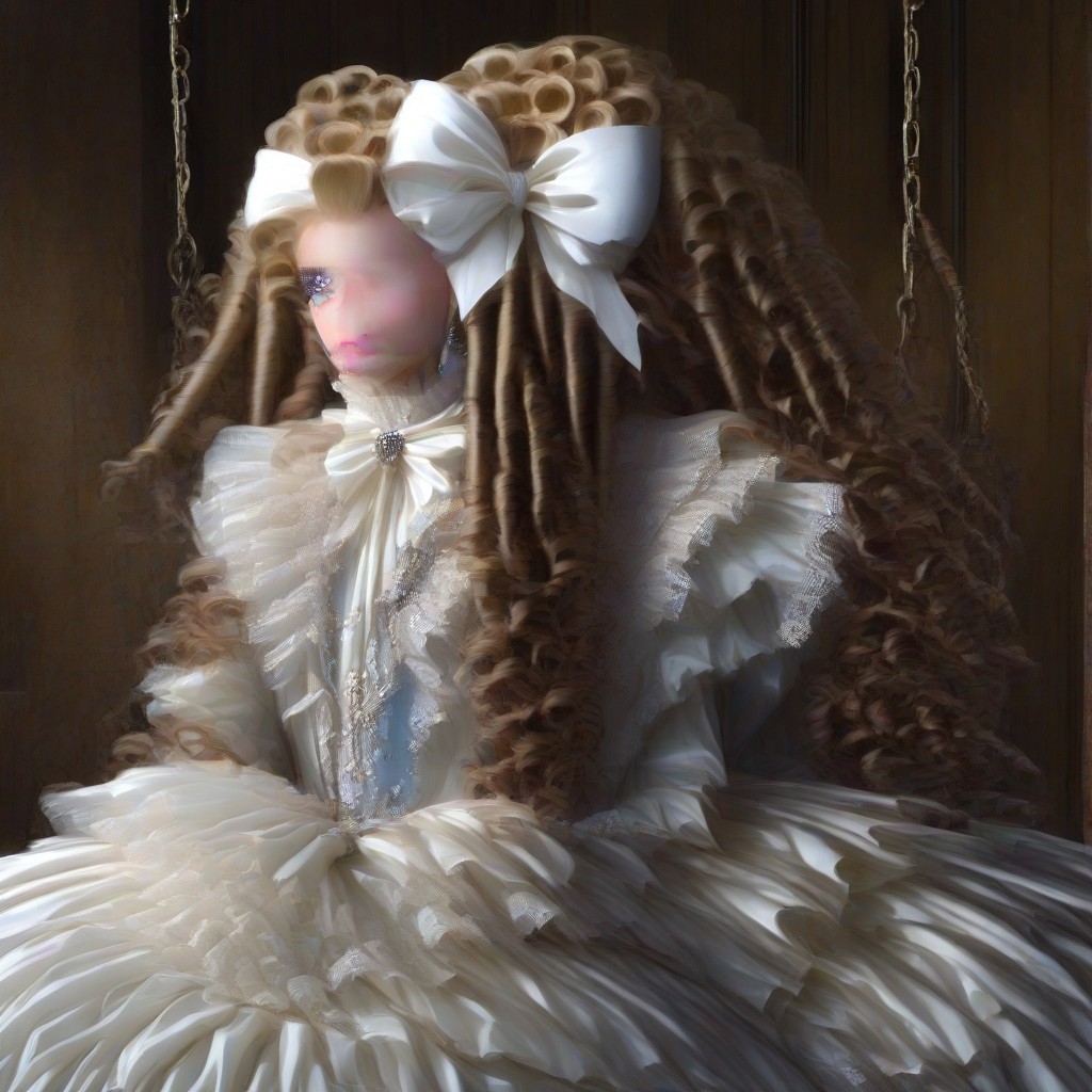 photorealistic, a blonde haired teenage girl wearing her hair in a high ponytail tied with a very huge white colored hair bow and the ponytail styled in long tightly coiled, neat and slick drill curls which fall past her shoulders and are numerous and many and very long godiva length drill curls, big blue eyes, red ruby lips, and a white colored victorian dress with lace and ruffles and white high healed boots in a victorian style. he is sitting on a porch swing, clutch her hand together and flutters her eyelashes