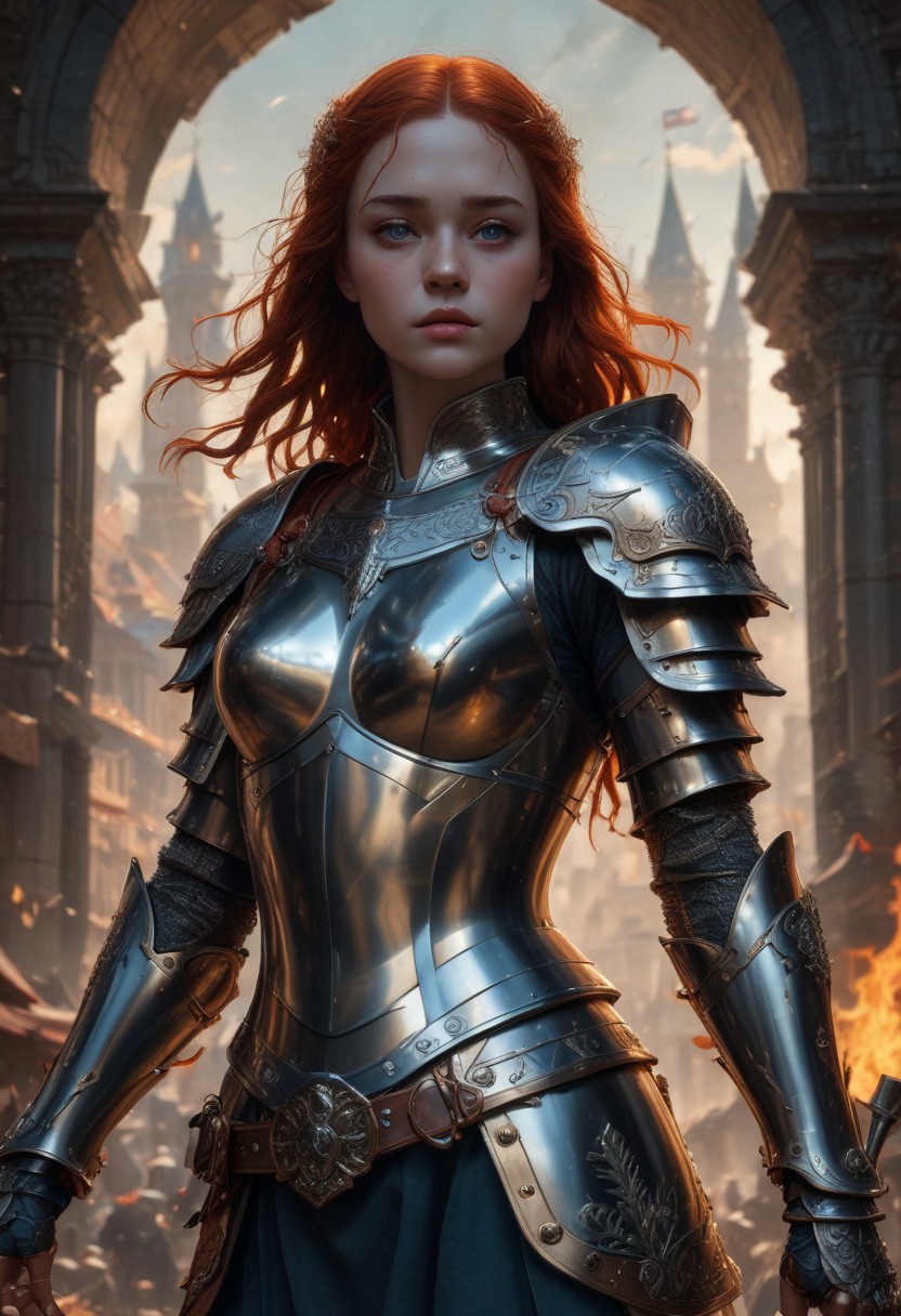 High resolution ultra-realistic of Beautiful Warrior Sadie Sink as Joan of Arc, 8k, capturing the intensity of the moment, cinematic lighting, standing on a bloody and stormy battlefield in bloody battle, wavy red hair, realistic dirty pale face, realistic blue eyes, beautiful hourglass figure, burning in a medieval Town, intricately designed iron and silver armor, Dark Ages Aesthetic, perfect athletic figure, beautiful Warrior Joan of Arc, fire, ultra realistic, cinematic style, vigorous and seductive, athletic figure, dark fantasy, dramatic lighting, wet and sweaty skin, dirty skin, athletic figure, dark fantasy, dramatic lighting, Greg Rutkowski style,, Warrior Joan of Arc on in iron armor, hyper-detailed, hyper-realistic, bright colours, Attractive 21 old years girl, Attractive, beautiful firm Breasts, sharp focus, digital painting, Photograph Taken on Nikon D750, Alphonse Mucha, 8K, athletic figure, Hyperdetailed, hyperrealism, Attractive, Attractive bust girl, asymmetric balance