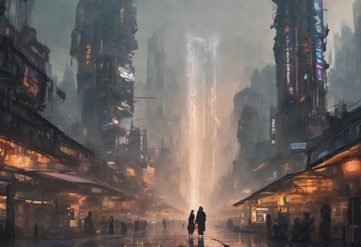 blade runner artwork, blader runner style, key visual, futuristic, night, ultra realistic, beautiful, rainy, cyberpunk, (sci-fi:1.5) BREAK a futuristic Egyptian metropolis, sleek pyramids and towering buildings of all shapes and sizes, a man wearing a mantle walks over a futuristic market, many market stalls with goods, exotic people, robots, dystopian steaming, leaves running ((colossal holographic billboards)) and (floating platforms), cycle rickshaws