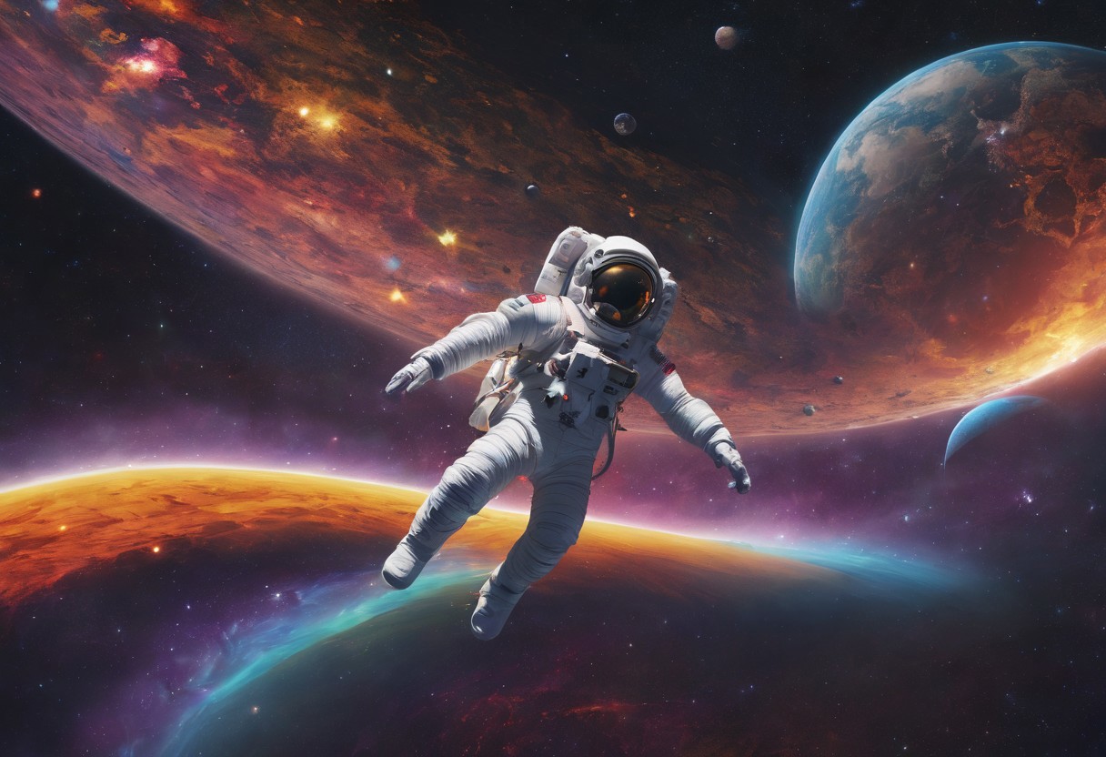 an astronaut floats through space, helpless, stranded, stars and planets, blackness of space with vibrant stars and planets in background