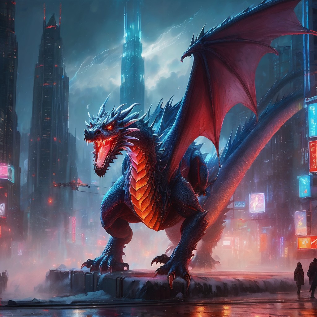score_9, score_8_up, score_7_up, best quality, masterpiece, evil frozen dragon, hyper-realistic, cyberpunk cityscape, glowing neon lights, towering skyscrapers, snowing heavily, dragon's eyes glowing icy blue, surrounded by bright thunder and firefly-like red lightning, holding a futuristic energy sword, metallic scales reflecting neon hues, foggy atmosphere, light particles scattering, intense cold mist swirling around the dragon, ready for battle, snow-covered streets, dragon in mid-flight, moon visible through the haze, detailed city skyline, dynamic pose.