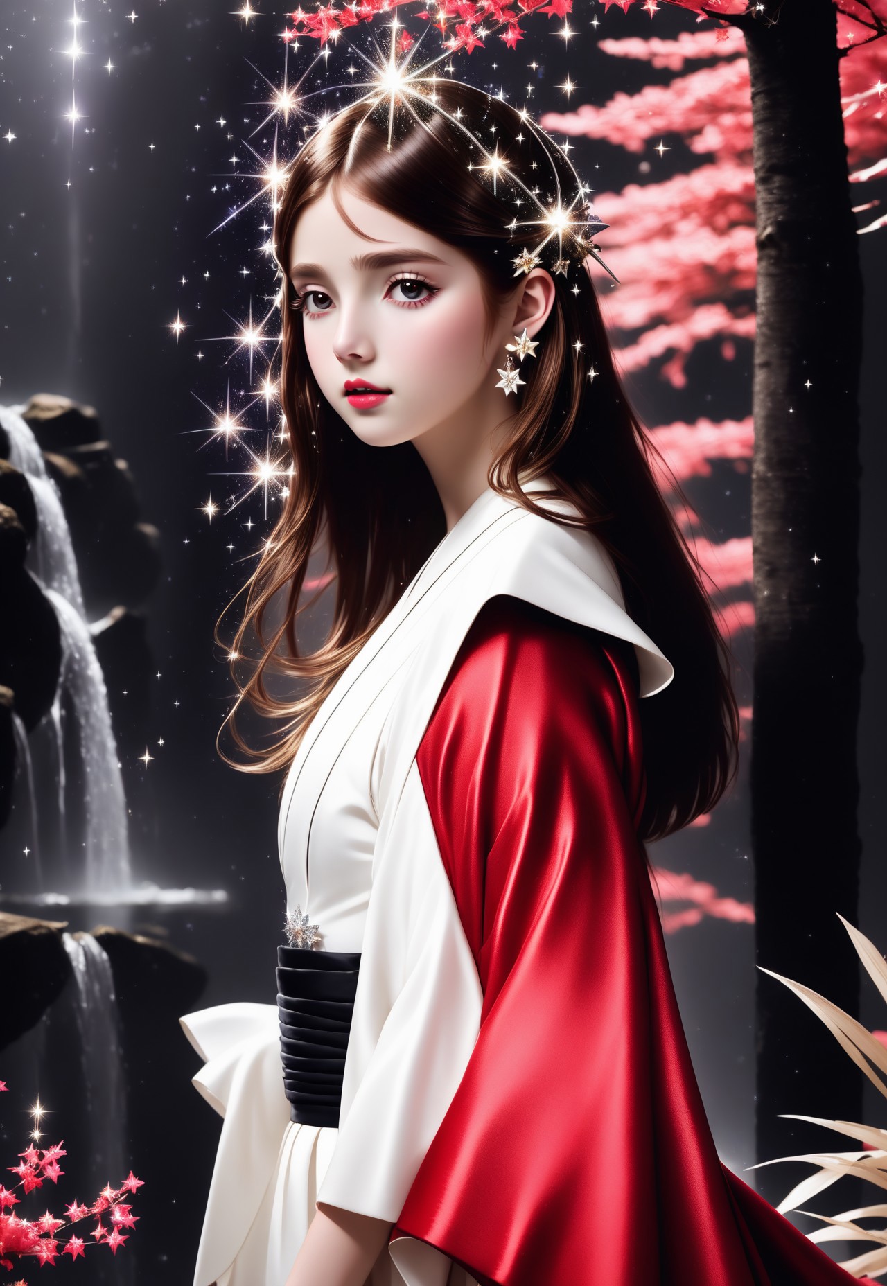 Sparkling, 8K, UHD. Creative compositon. Realistic style. AI_girl doll, (expression doll face cute:1.10), japanese (princess japanese dress with gown:1.10),(visible eyes, nose and mouth:1.10) princess, oval face, (beautiful sparkling precious japanese princess crown:1.10), (night time with shooting stars:1.09), and (one full-moon:1.05), (moon rays on her :1.09), a beautiful cute princess by the (flowing long wavy brown thick hair:1.10), and (cute korean black eyes:1.05), assymetric eyes, (two eye iris:1.05), perfect eyes, (blunt bangs:1.05), (she looks at you:1.10), (hand on her own face:1.10), (relaxed hands and thin hands fingers too:1.10), (dynamic arms and hands pose:1.20) (five fingers:1.10), (wide smile:1.05), (mouth open:1.10), (perfect white teeth:1.05), (cute behavior:1.05), shy and pure (red blushing:1.10), (luxury japanese manor behind her:1.10), Japanese Garden, she's in her japanese zen garden with beautiful flowers. Beautiful composition illustration. (Visible background:1.10), (visible image:1.15) fashion_theme trending. BREAK Absurd, masterpiece, artwork, trending, trendy, (24 years old) BadDream, natural skin texture & pores. RAW photo, high detailed skin, 8k, dslr, soft lighting, film grain, epic composition, Fujifilm XT3, Canon R5, (amazing cute SFX:1.15). (american piano shot:1.10)