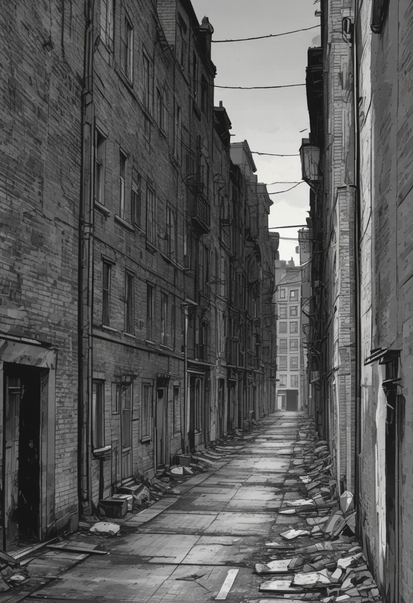A dimly lit 2D alley at night, with tall, shadowy buildings on either side. The only light comes from a flickering streetlamp casting long, dark shadows on the cracked pavement. Trash cans and debris line the alley, adding to the eerie atmosphere