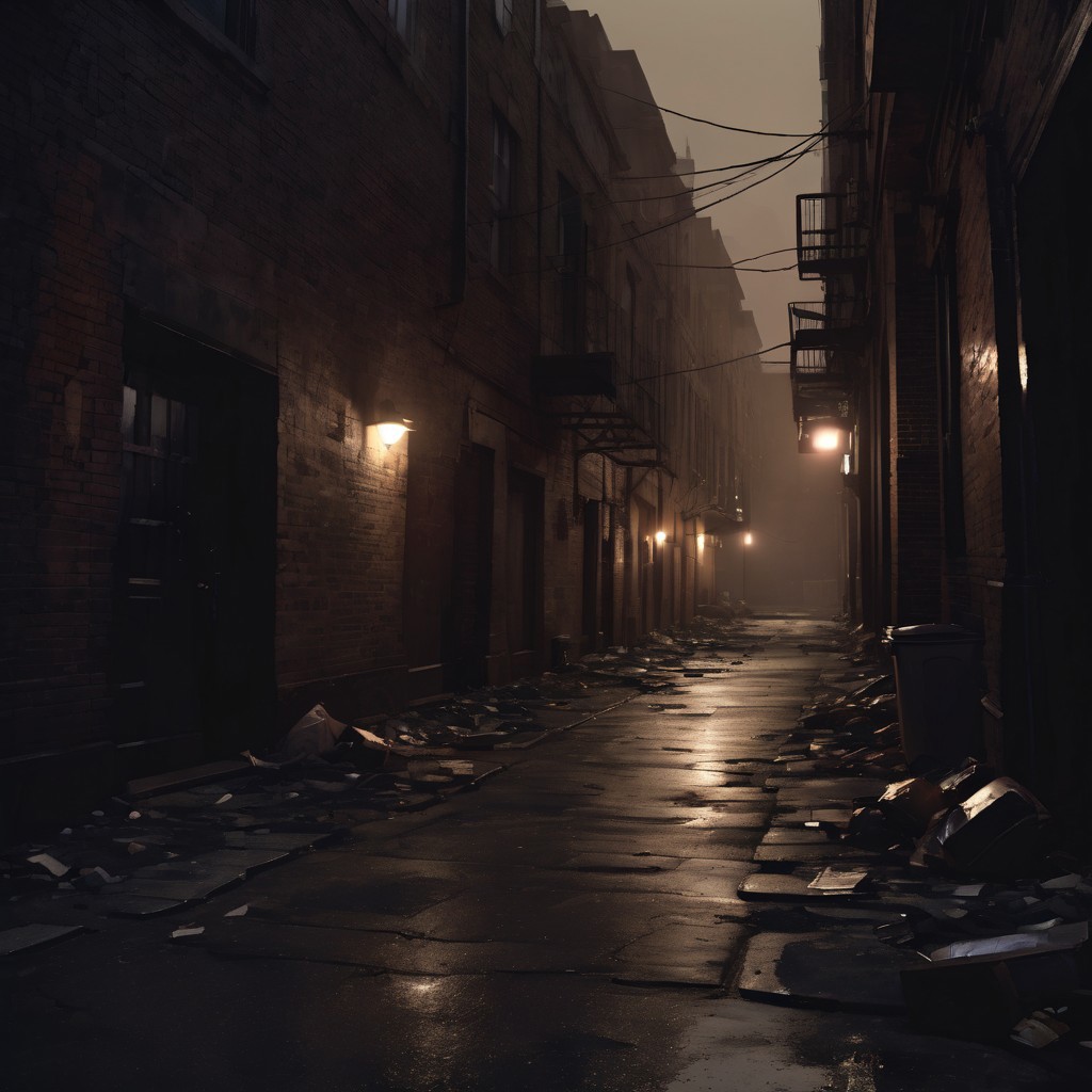A dimly lit 2D alley at night, with tall, shadowy buildings on either side. The only light comes from a flickering streetlamp casting long, dark shadows on the cracked pavement. Trash cans and debris line the alley, adding to the eerie atmosphere