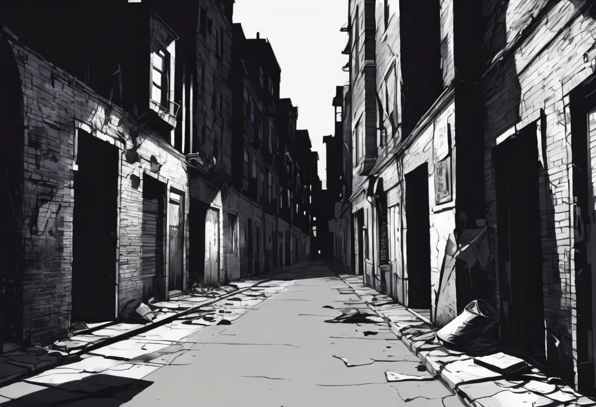 A dimly lit 2D alley at night, with tall, shadowy buildings on either side. The only light comes from a flickering streetlamp casting long, dark shadows on the cracked pavement. Trash cans and debris line the alley, adding to the eerie atmosphere